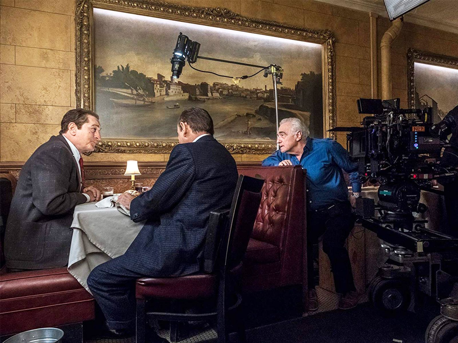 De este modo se ponían de acuerdo para rodar una de las tantas escenas desarrolladas en un restaurante italiano. Aquí podemos ver a Robert De Niro, Joe Pesci y Martin Scorsese, a lado de una enorme cámara de cine.