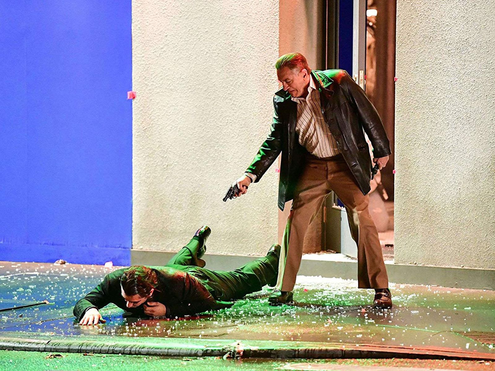 Es una historia de la mafia italiana, por su puesto hay una gran cantidad de muertes a la vieja escuela. ¿Notas esa pared azul? Bueno, es parte del armado del set que más tarde sería editado en postproducción.