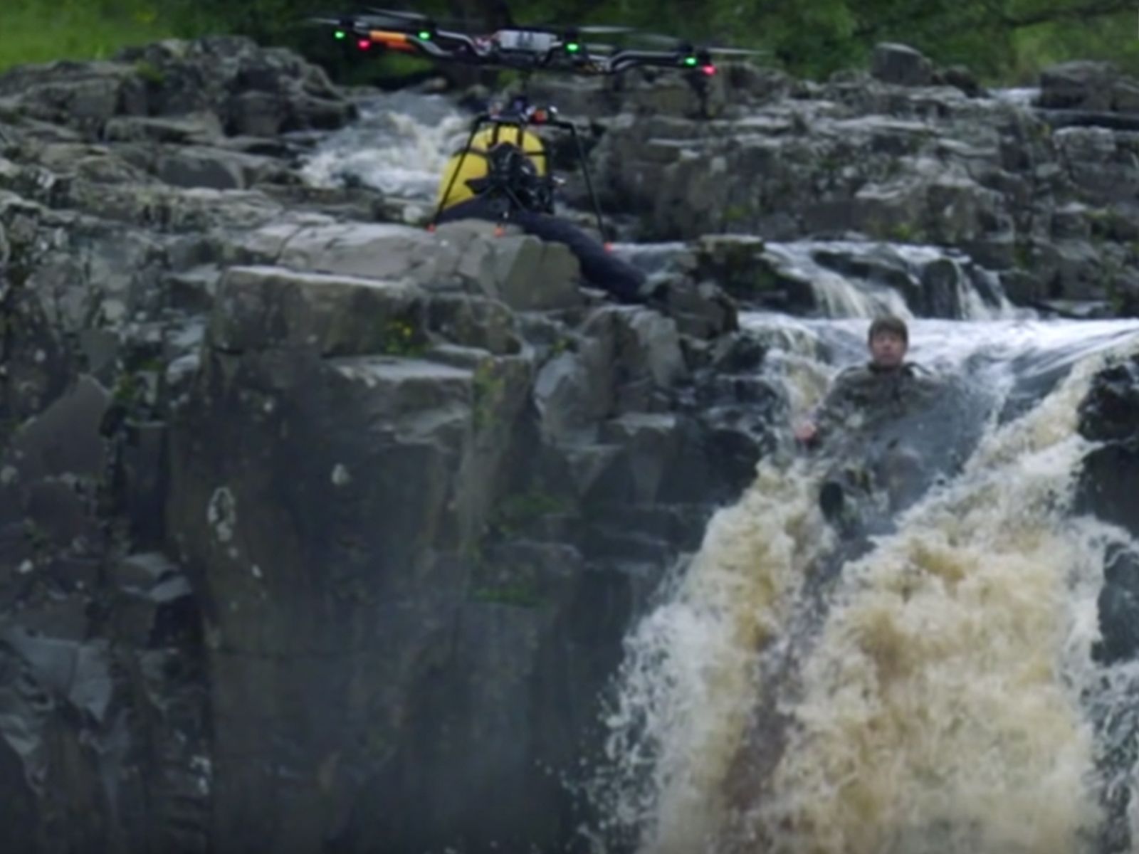 Observa la parte superior de la imagen, allí encontrarás un enorme dron con una cámara; fue así como rodaron esta escena donde Schofield (George MacKay) desciende peligrosamente por una cascada.