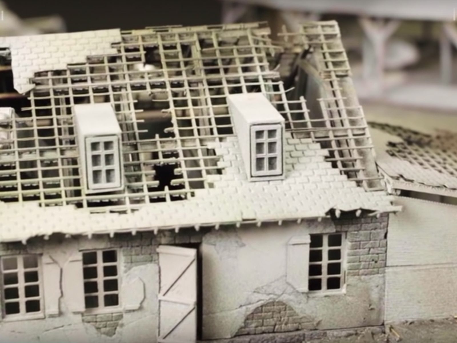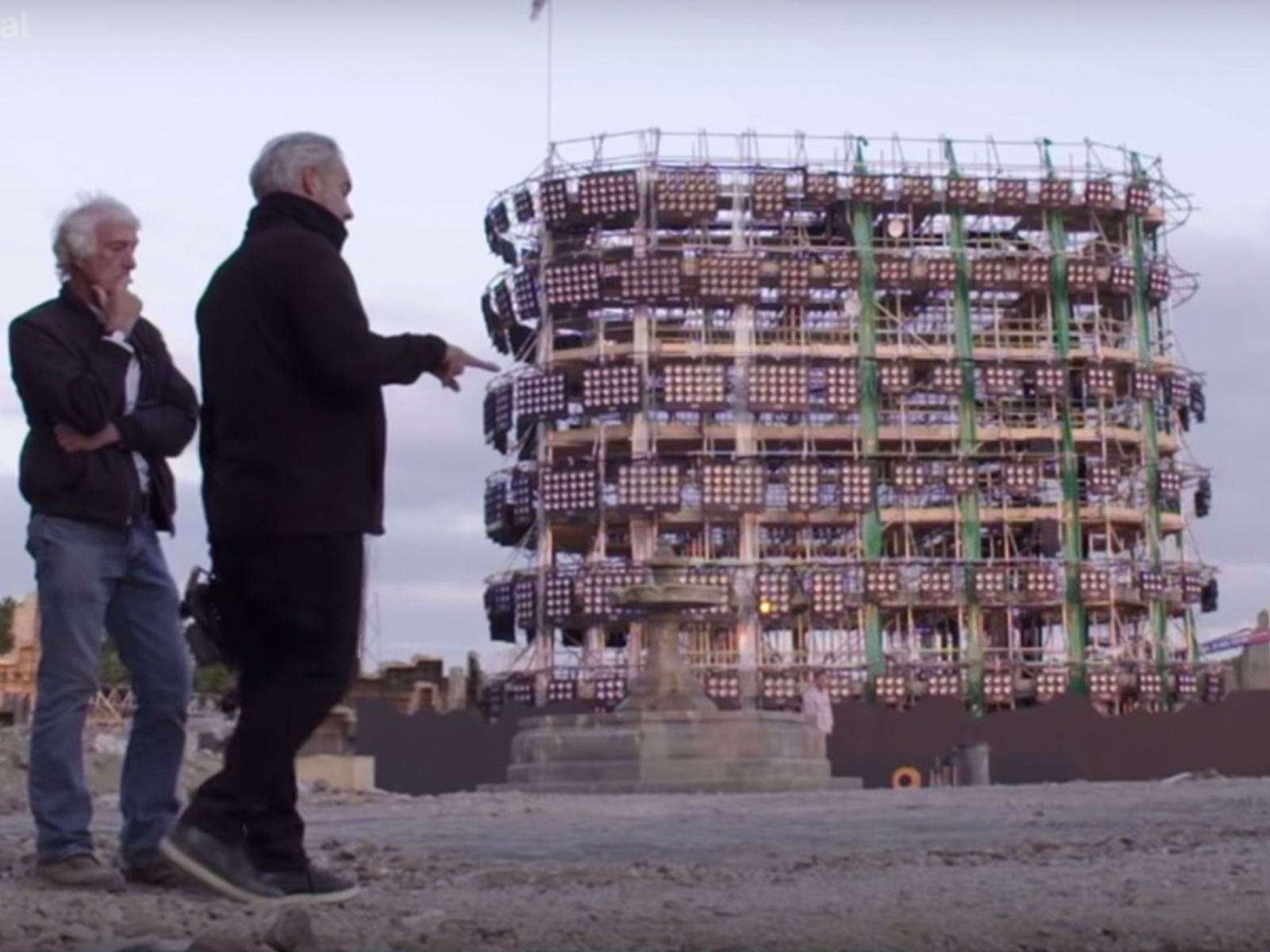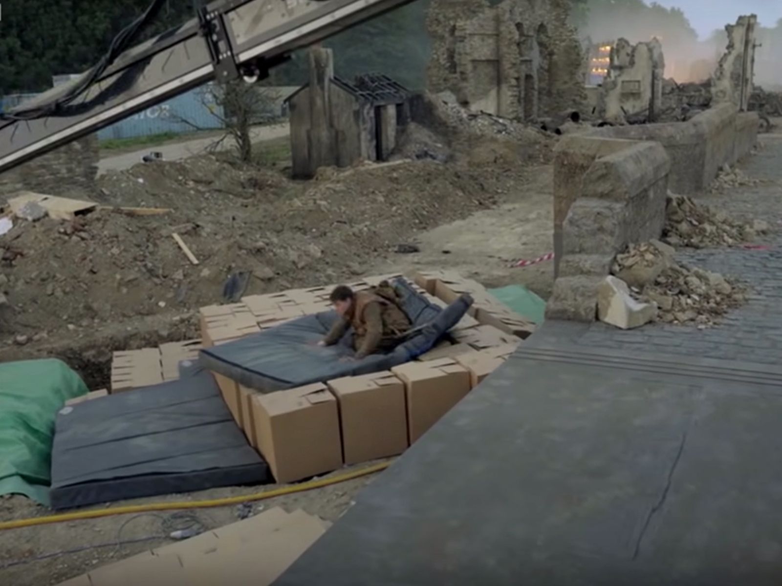 Sam Mendes y Roger Deakins planean la siguiente escena, ¿recuerdas cuando Schofield se encuentra con un edificio en llamas? Aquí está la estructura original, misma que tenía luces tenues en tonos rojos y anaranjados para simular las llamas. El resto es postproducción.