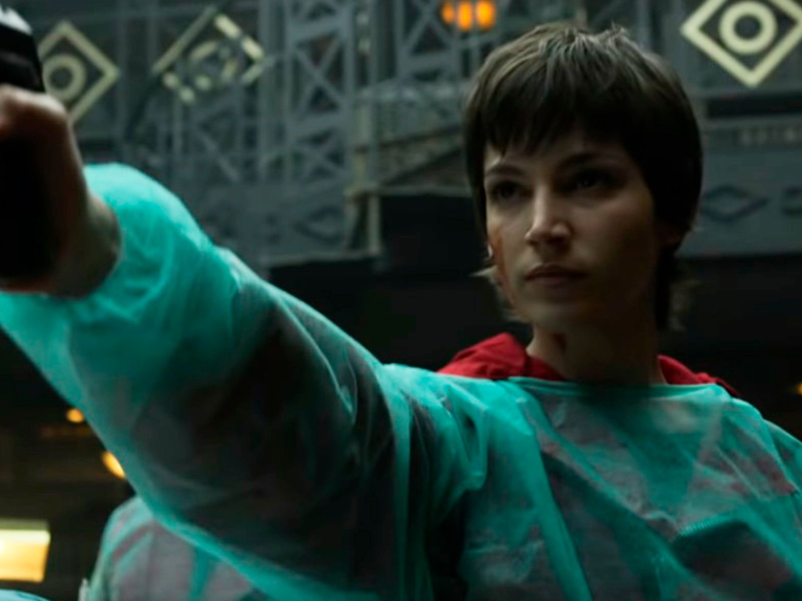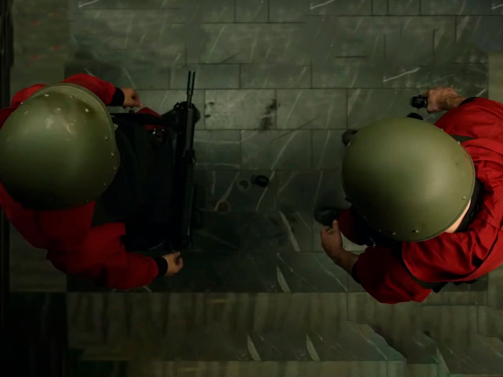 Marsella aparece sin máscara en esta imagen y alguien la acompaña. A juzgar por el cabello de esa persona es el Profesor, quien llega al Banco de España para tratar de cambiar el rumbo de la operación. Nuevamente lo veremos en trabajo de campo con el equipo.