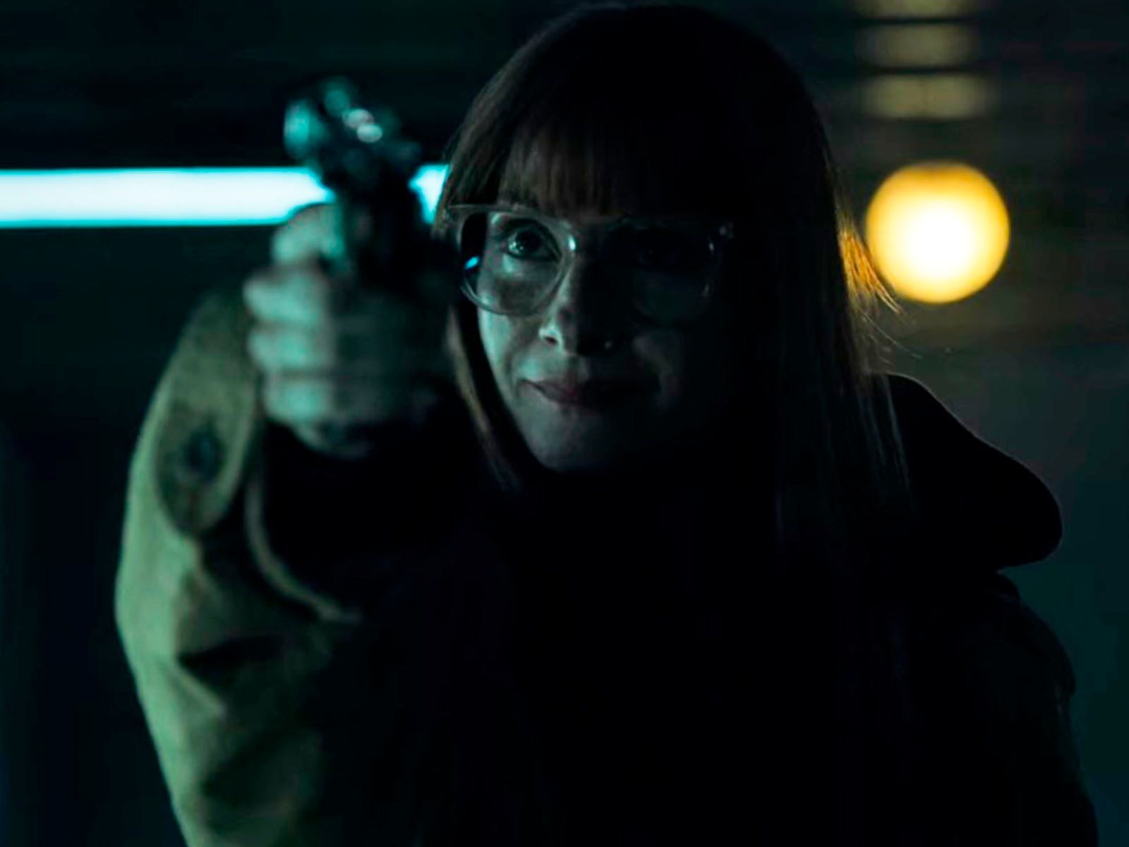 Después de ser buscada por la policía por delatar a prácticamente todo el gobierno sobre sus tratos turbios, Alicia Sierra (Najwa Nimri) encuentra el escondite de El Profesor y lo amenaza con una pistola.