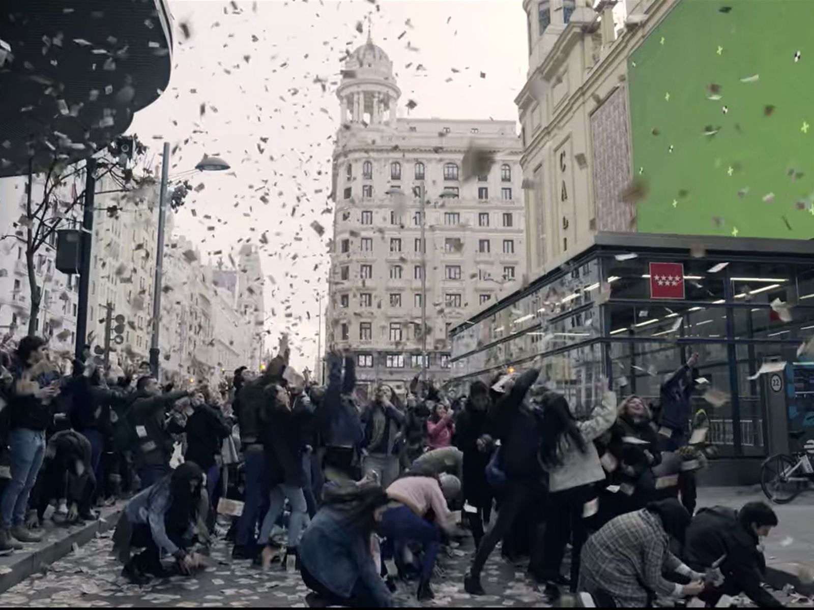 Para rodar la escena de los millones de euros cayendo en el centro de Madrid, la producción tuvo que enfrentar problemas técnicos, clima cambiante, extras desesperados y decenas de tomas fallidas.
