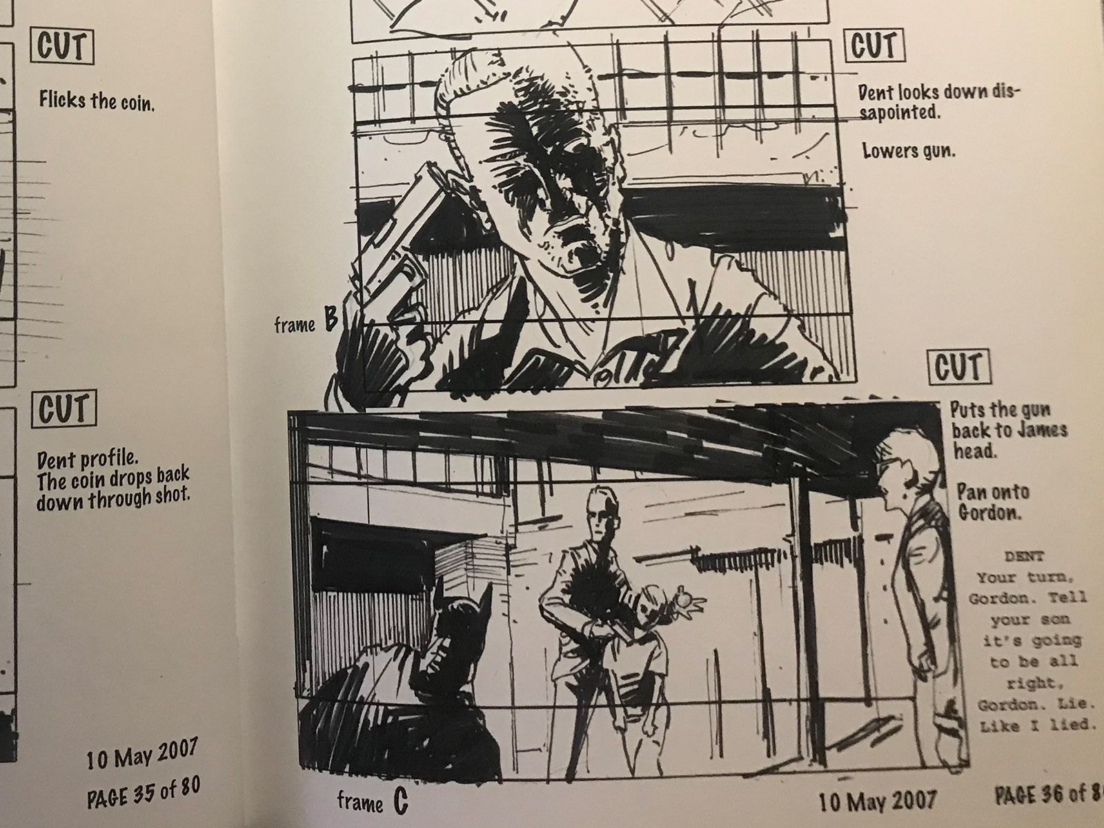 En este storyboard del momento de Dos caras con el hijo de Gordon (Gary Oldman) podemos notar las marcas técnicas que estarían a punto de saltar al lenguaje cinematográfico con cámaras en mano.