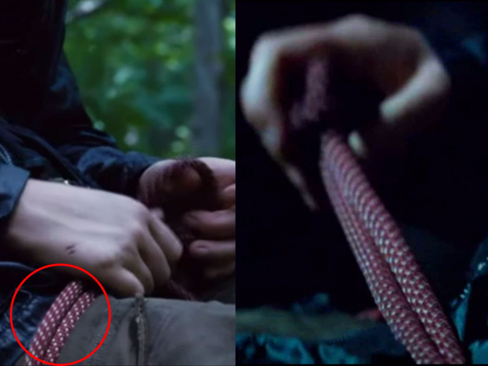 Mientras Katniss (Jennifer Lawrence) descansa sobre una rama de árbol, desde el Capitolio deciden crear un incendio para hacerla bajar, esto hace que se desate de prisa y salga corriendo sin tomar nada a su paso; esa misma noche Katniss vuelve a amarrarse con... ¿la soga que dejó kilómetros atrás?