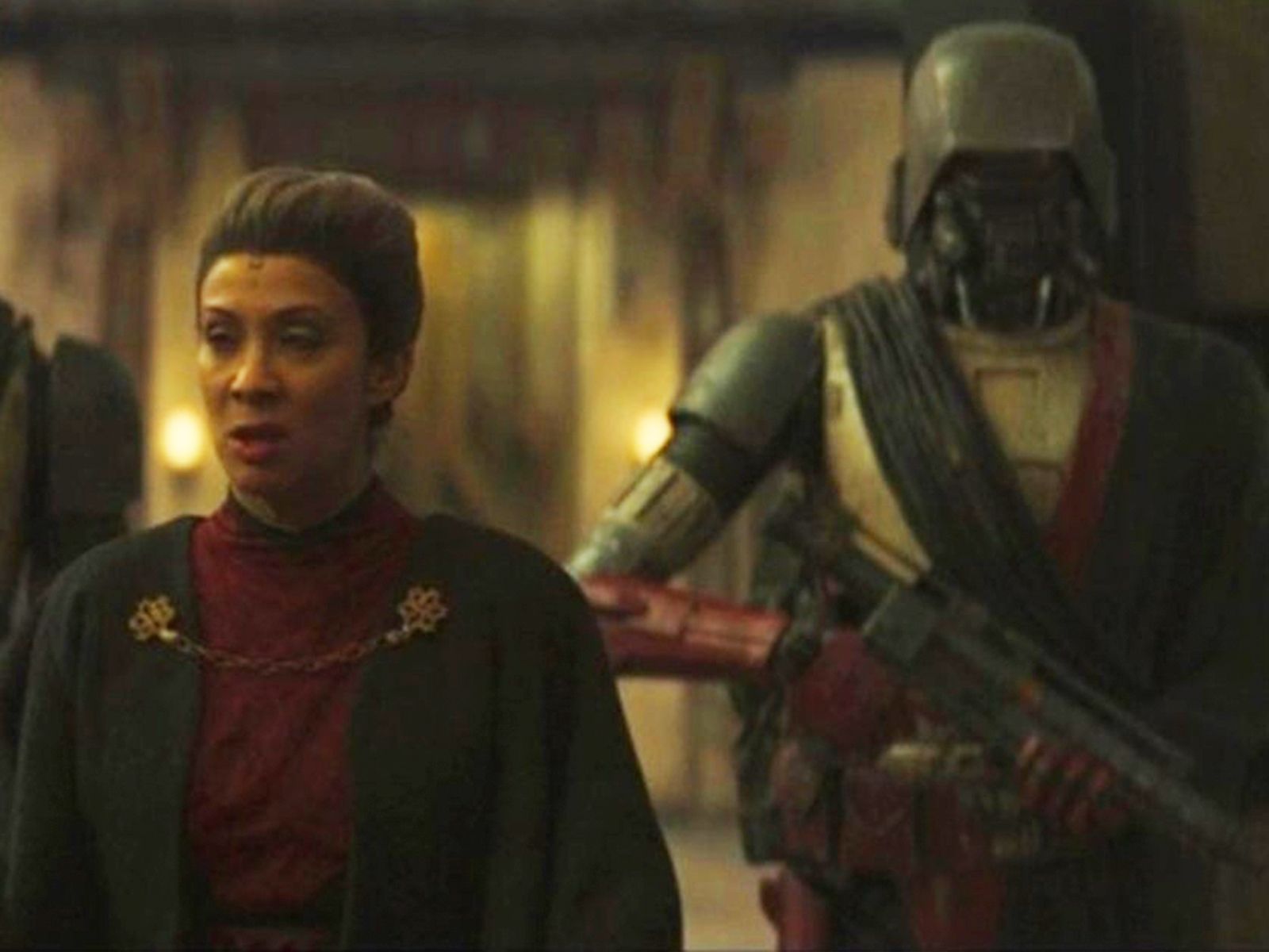 Los peligrosos droides asesinos HK que defienden a Morgan Elsbeth (Diana Lee Inosanto) llevan en su cabeza el emblema de la Séptima Flota, la cual es comandada por el Gran Almirante Thrawn. Ahora mismo es casi inevitable su presencia en The Mandalorian.