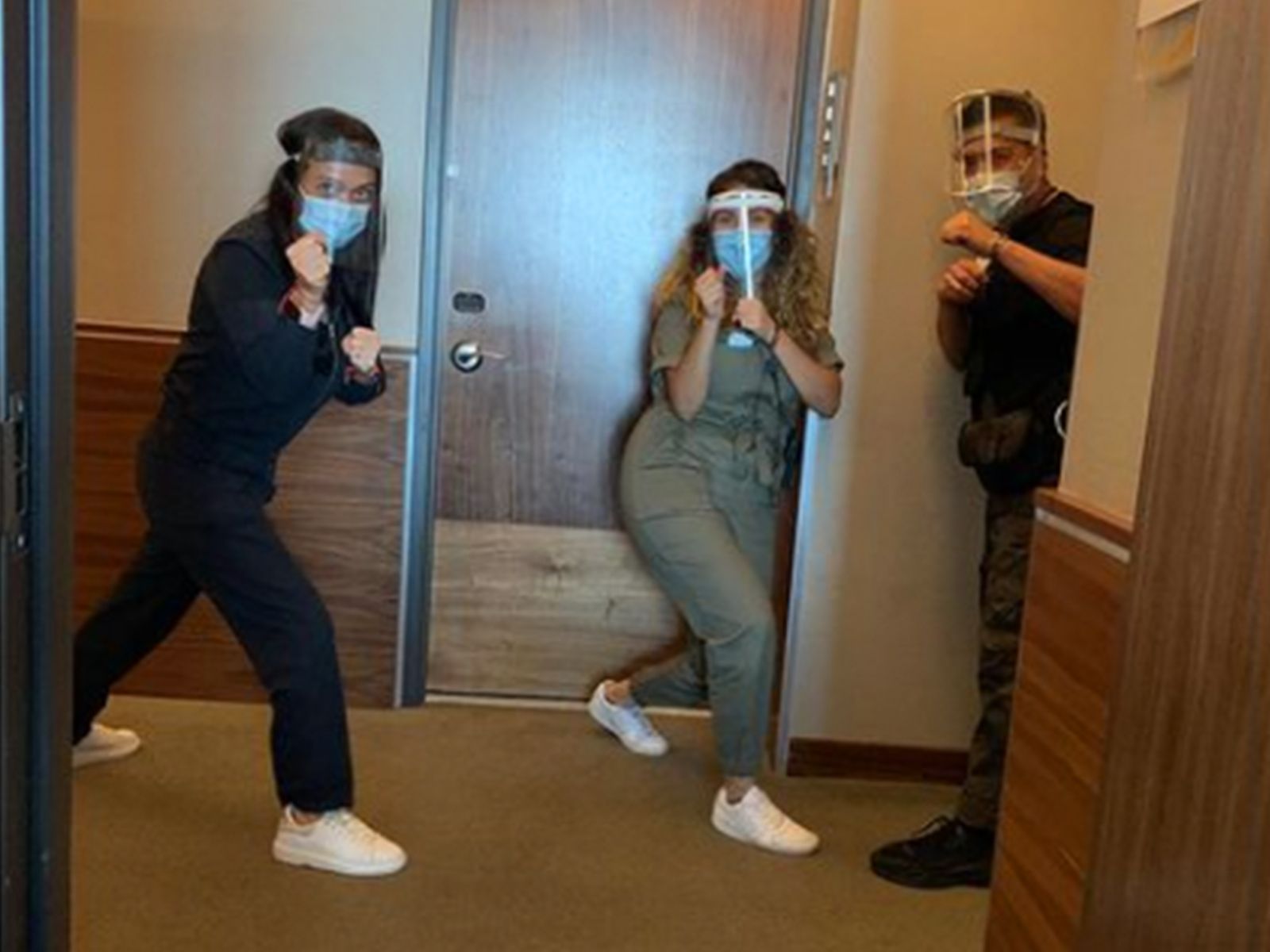 Los miembros de la producción de Monarca encargados de llevar la ropa de cada personaje a sus respectivos intérpretes debían acatar todas las medidas de sanidad: desde cubrebocas, careta de plástico y por supuesto, sana distancia; todo lo hacían con gran sentido del humor.