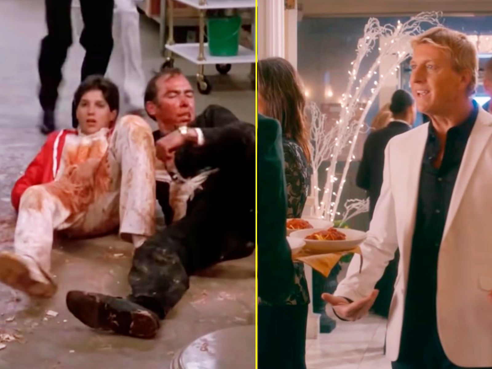 En Karate Kid, Daniel (Ralph Macchio) es ensuciado sin querer con un montón de spaghetti mientras espía en el salón. En la temporada 3 de Cobra Kai casi sucede algo similar, pero con Johnny (William Zabka) y en el mismo lugar, sólo que logró esquivar al mesero a tiempo.