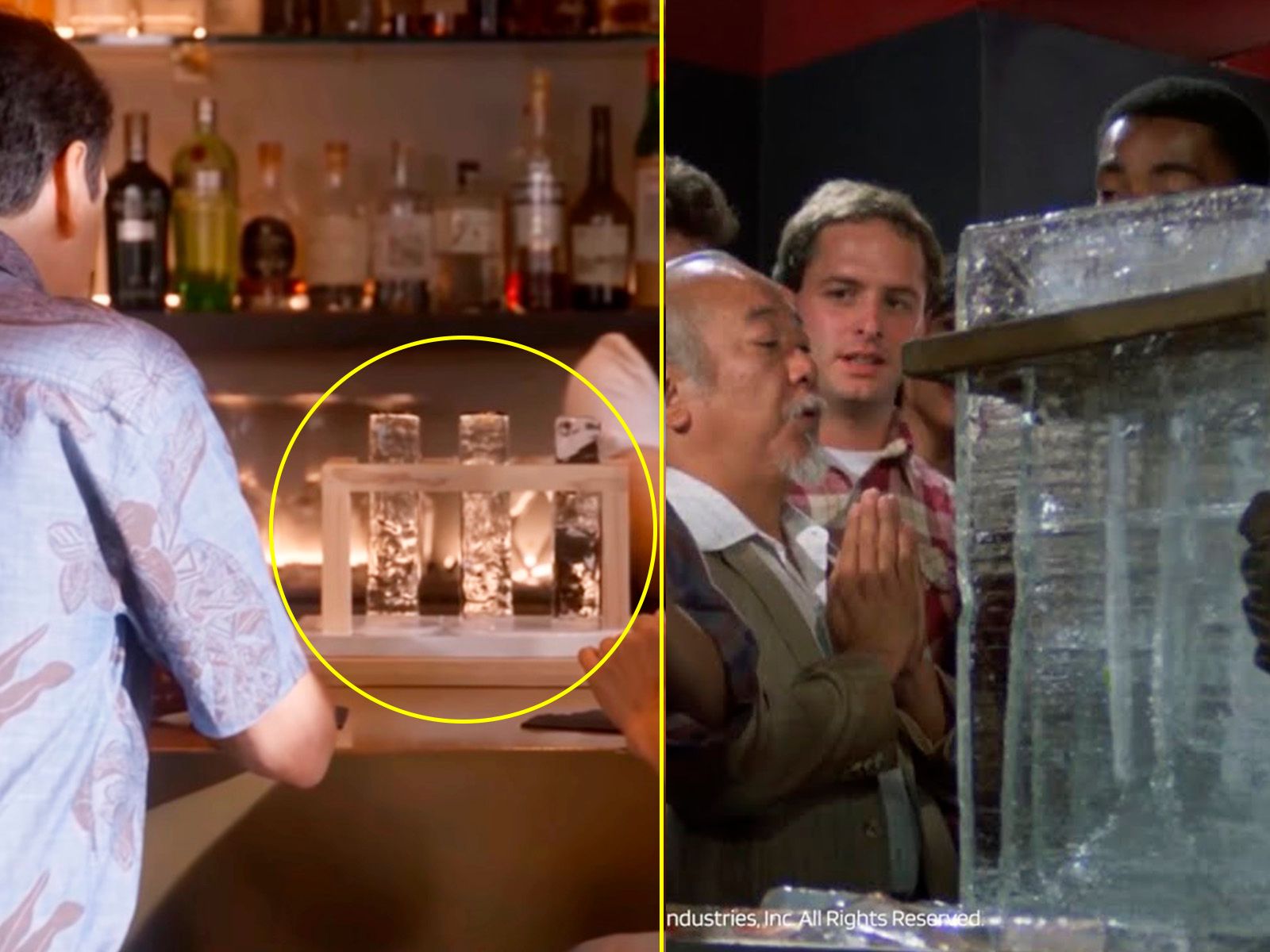 En el reencuentro de Daniel (Ralph Macchio) con Kumiko (Tamlyn Tomita) en la barra hay unos bloques de hielo, lo que nos lleva a ligar esto con el reto que tuvo el chico en Karate Kid 2, cuando justo tenía que romper con su mano una hilera de bloques gélidos.