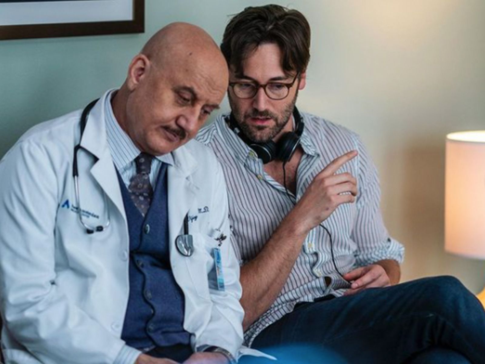 ¿Sabías que Ryan Eggold, quien interpreta a Max, también dirigió un episodio de New Amsterdam? Por esta razón en esta imagen utiliza lentes y unos audífonos en el cuello, se encontraba dando instrucciones al carismático Anupam Kher.