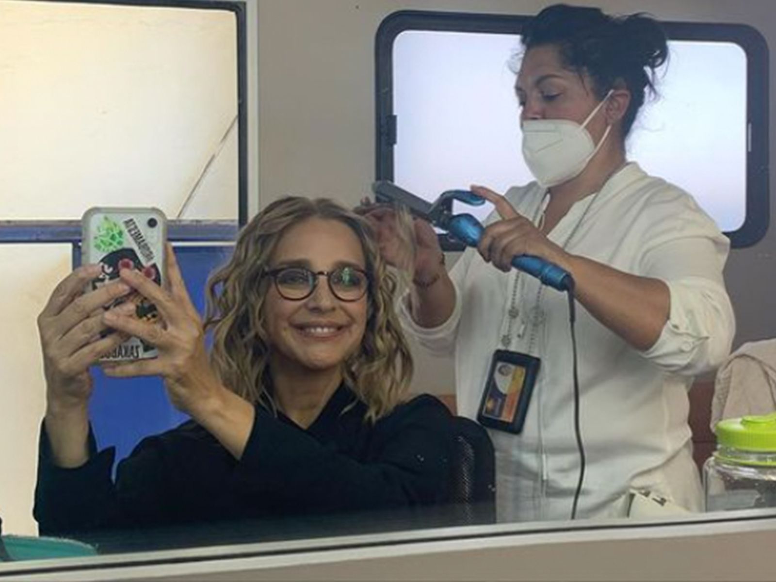 Hasta el mínimo detalle en cada peinado y maquillaje es perfectamente planeado, aquí podemos ver a Claudia Ramírez sonriente frente al espejo poco antes de rodar la escena del día en ¿Quién mató a Sara?