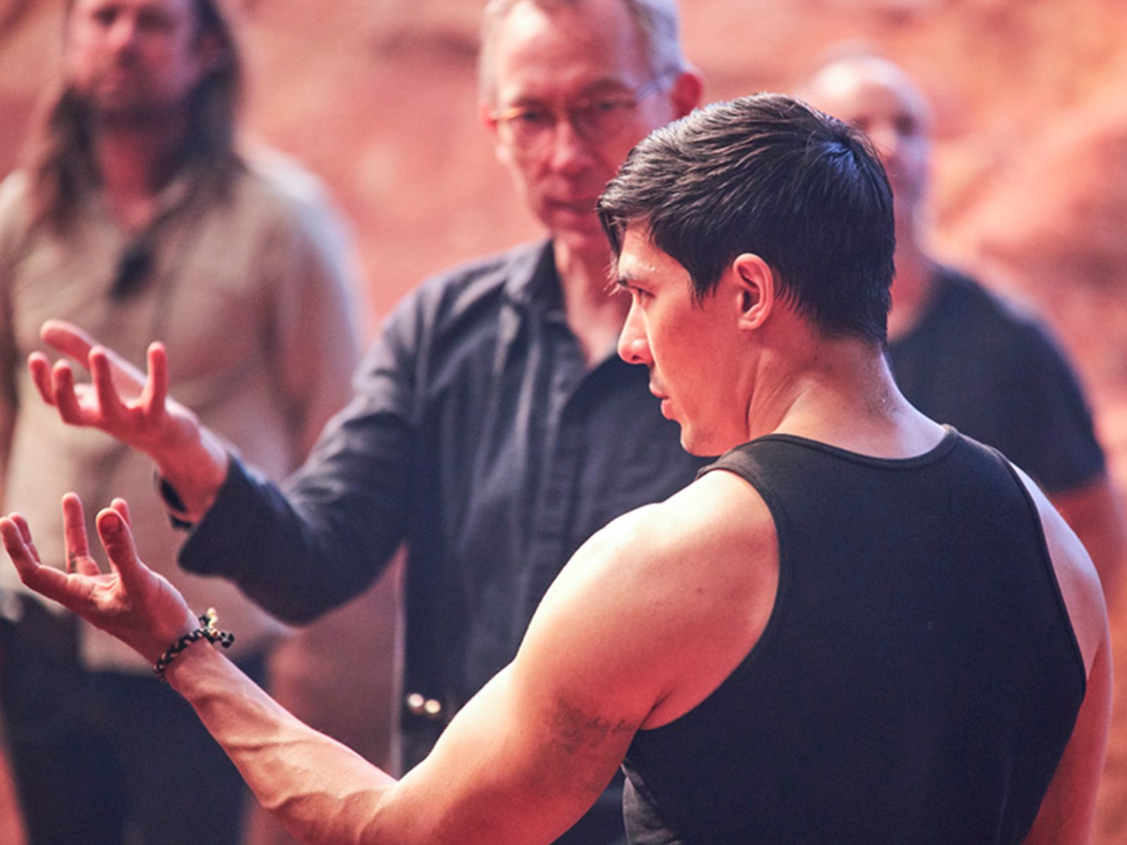 El director señalándole a Lewis Tan la posición que su mano debía adoptar para que Cole Young luciera genial en una de las escenas de Mortal Kombat.