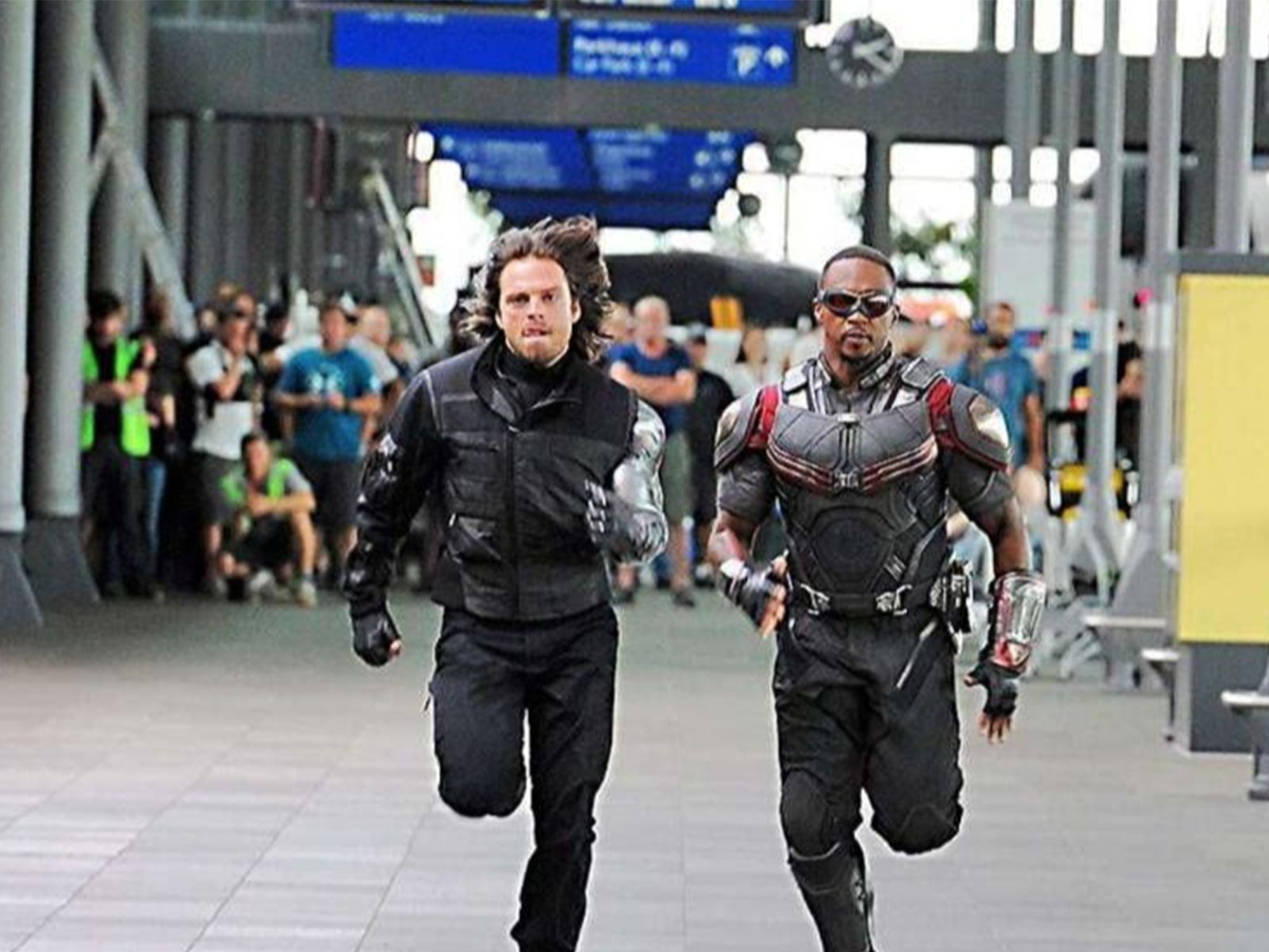 Esta es una de las imágenes detrás de cámaras de Capitán América: Civil War, tan sólo observa la multitud detrás de Sebastian Stan y Anthony Mackie, todos son miembros de la producción. Las películas de Marvel son el ejemplo perfecto de blockbuster.