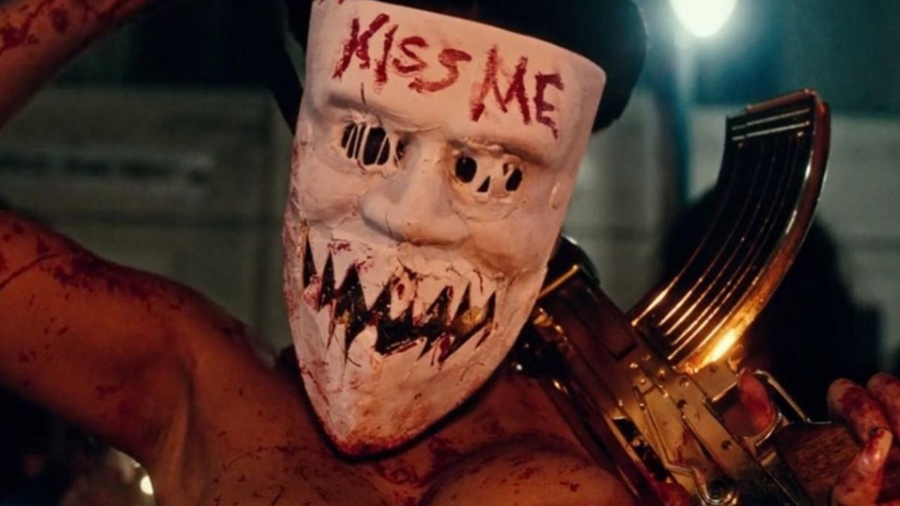 En 12 horas para sobrevivir: El año de la elección vemos esta máscara con la leyenda "Bésame" en la frente, una invitación irónica dada la forma alargada, dientes afilados y ojos atrofiados.