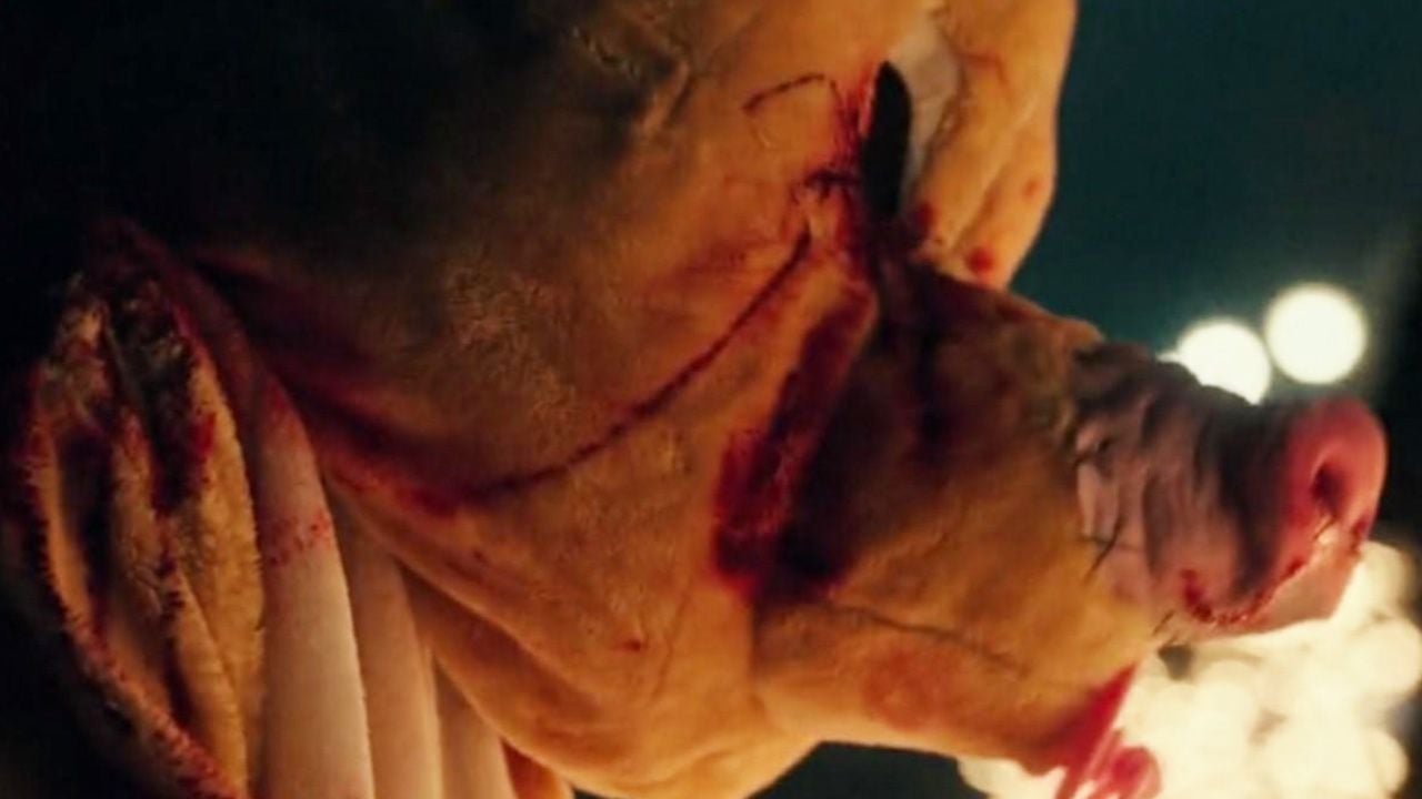 En 12 horas para sobrevivir: El año de la elección aparece esta máscara de un cerdo que se vuelve terrorífica cuando observamos que tiene superpuesta una nariz real de un puerco con todo y sangre.