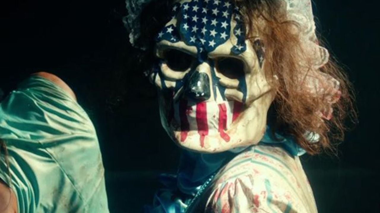 En 12 horas para sobrevivir: El año de la elección se puede ver esta máscara patriótica y terrorífica; el diseño de calavera y hasta el cabello de la portadora que le agrega un toque más desquiciado.