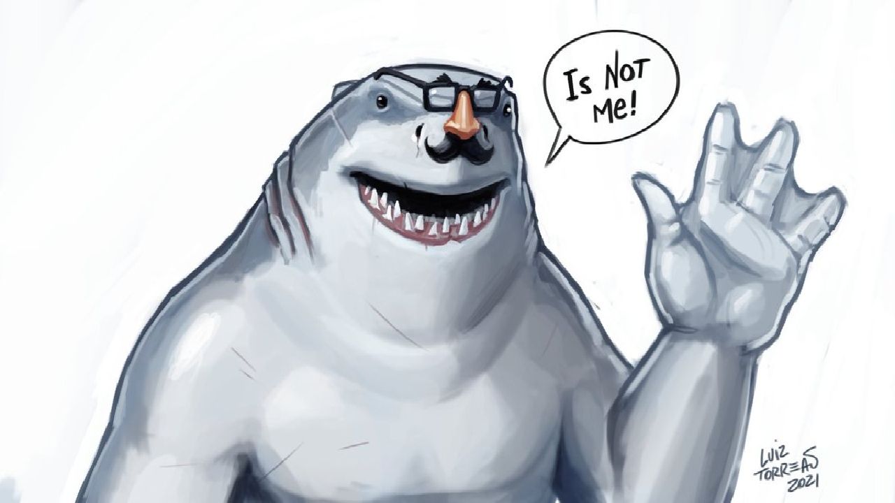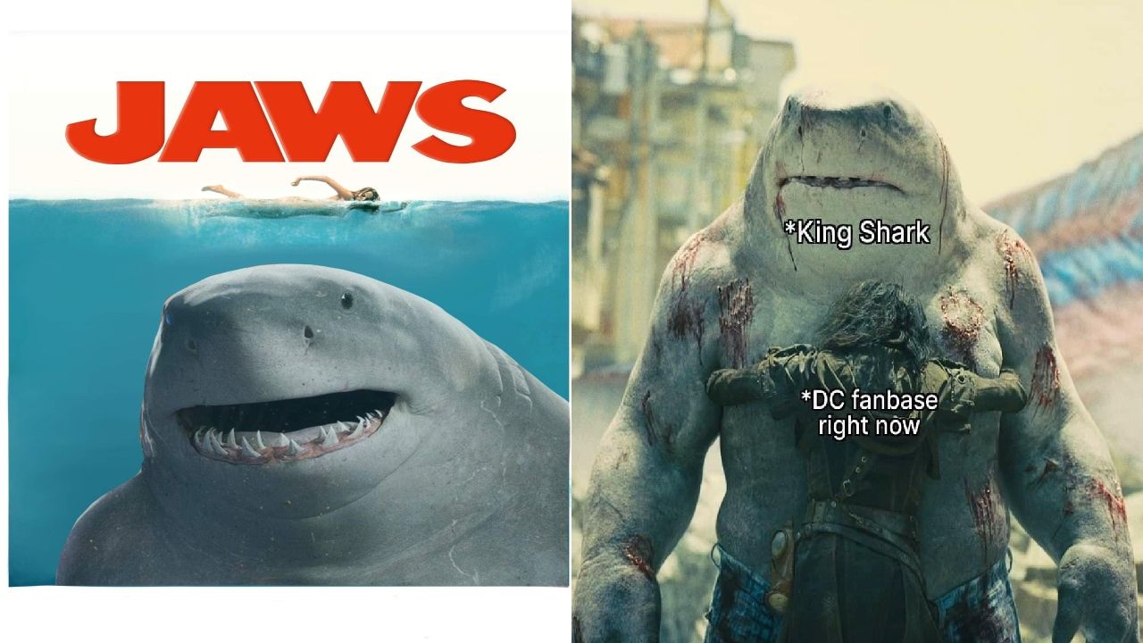 La saturación de memes de King Shark confirman el favoritismo del fandom de DC Cómics por el simpático y feroz Nanaue, aquí lo vemos tamién fusionado con la película Tiburón.