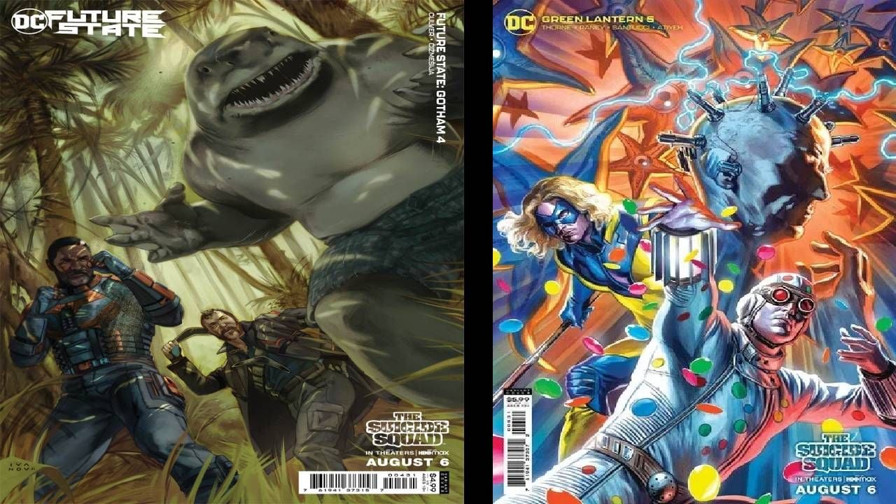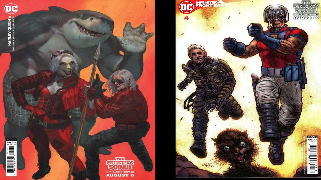 También, desde principios de mes, la editorial DC invadió 13 portadas de series grandes de títulos como Batman, Mujer Maravilla, Flash, Joker, Infinite Frontier, entre otras, para lanzar una serie de variantes exclusivas inspiradas directamente en la estética del filme, teniendo a nuestro representante mexicano Jorge Molina como uno de los lápices invitados a esta serie exclusiva. Su propuesta quedó inmortalizada en Suicide Squad #6 y es una de las más llamativas, pues vemos a Rick Flag (Joel Kinnaman) reflejado en el casco de un enfurecido Peacemaker (John Cena) mientras huye de una ráfaga de plomo disparada desde un helicóptero. Te presentamos las portadas y algunos fan arts que han invadido las redes sociales.