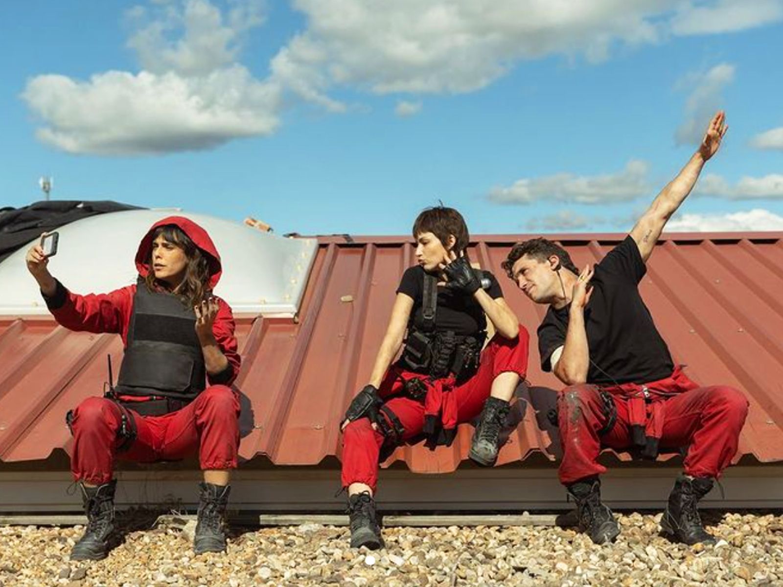 ¿Recuerdas el plan de El profesor (Álvaro Morte) para mover a su equipo por el techo? Así pasaban el tiempo muerto Belén Cuesta, Úrsula Corberó y Jaime Lorente mientras preparaban esta escena.