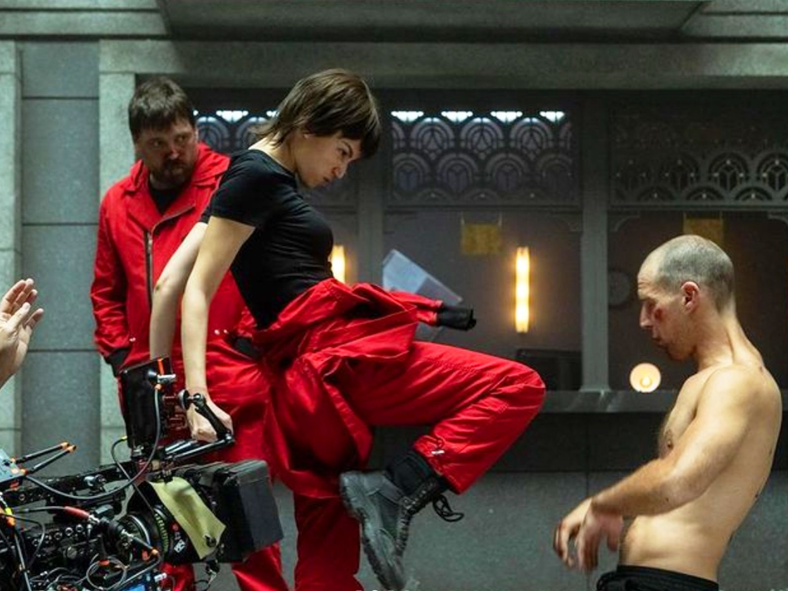 La temporada 5 (Volumen 1) de La casa de papel incrementó la dosis de acción y esta imágen de Tokio (Úrsula Corberó) lanzando un rodillazo por el aire es el mejor ejemplo, además se puede observar la cercanía de la cámara al cuerpo de la actriz, todo para conseguir una imágen única.