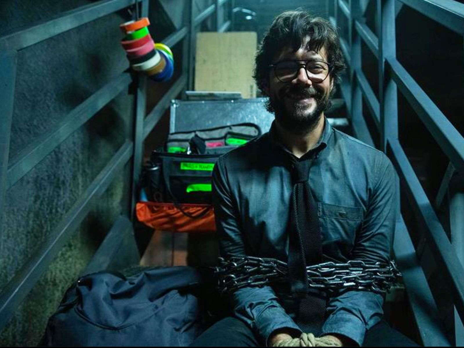 Esta imagen detrás de cámaras de La casa de papel demuestra que Álvaro Morte únicamente utiliza lentes para darle vida a El profesor.