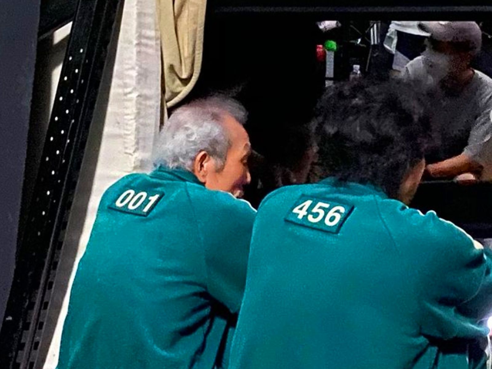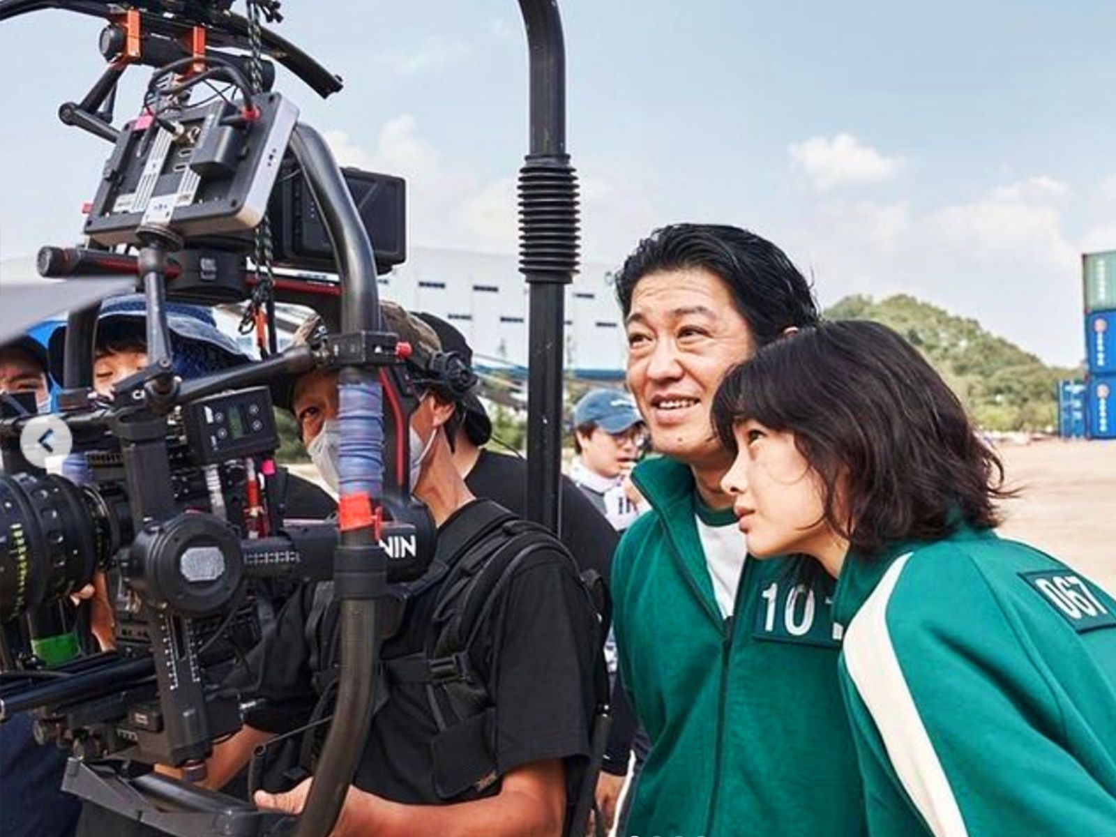 Esta imagen detrás de cámaras muestra a Dong-hyuk Hwang conversando con Lee Jung-jae y Park Hae Soo, quienes interpretaron a Seong Gi-hun y Sang-woo. En el fondo un miembro del staff preparando el siguiente escenario.