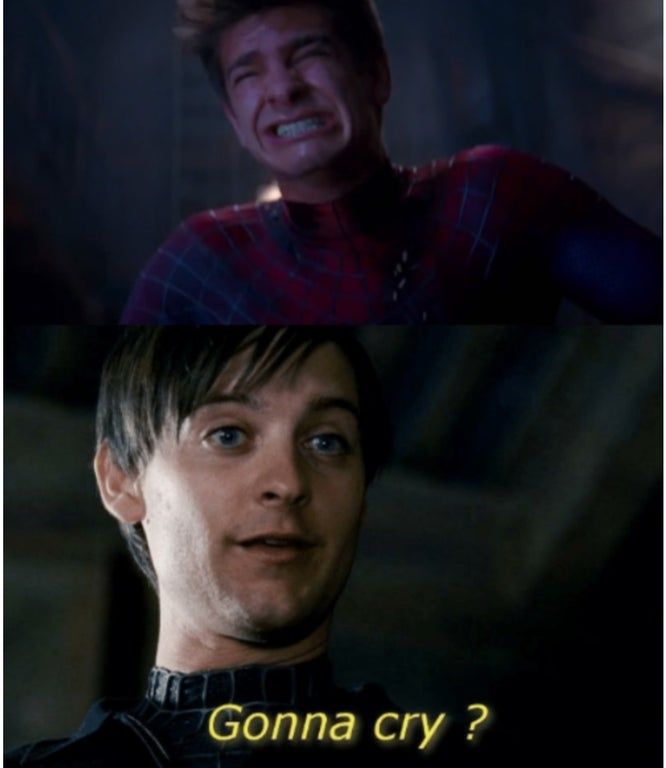 Andrew llorando porque no pudo salvar a Gwen y ¿quién mejor para burlarse de él que el Peter Emo de El hombre araña 3?