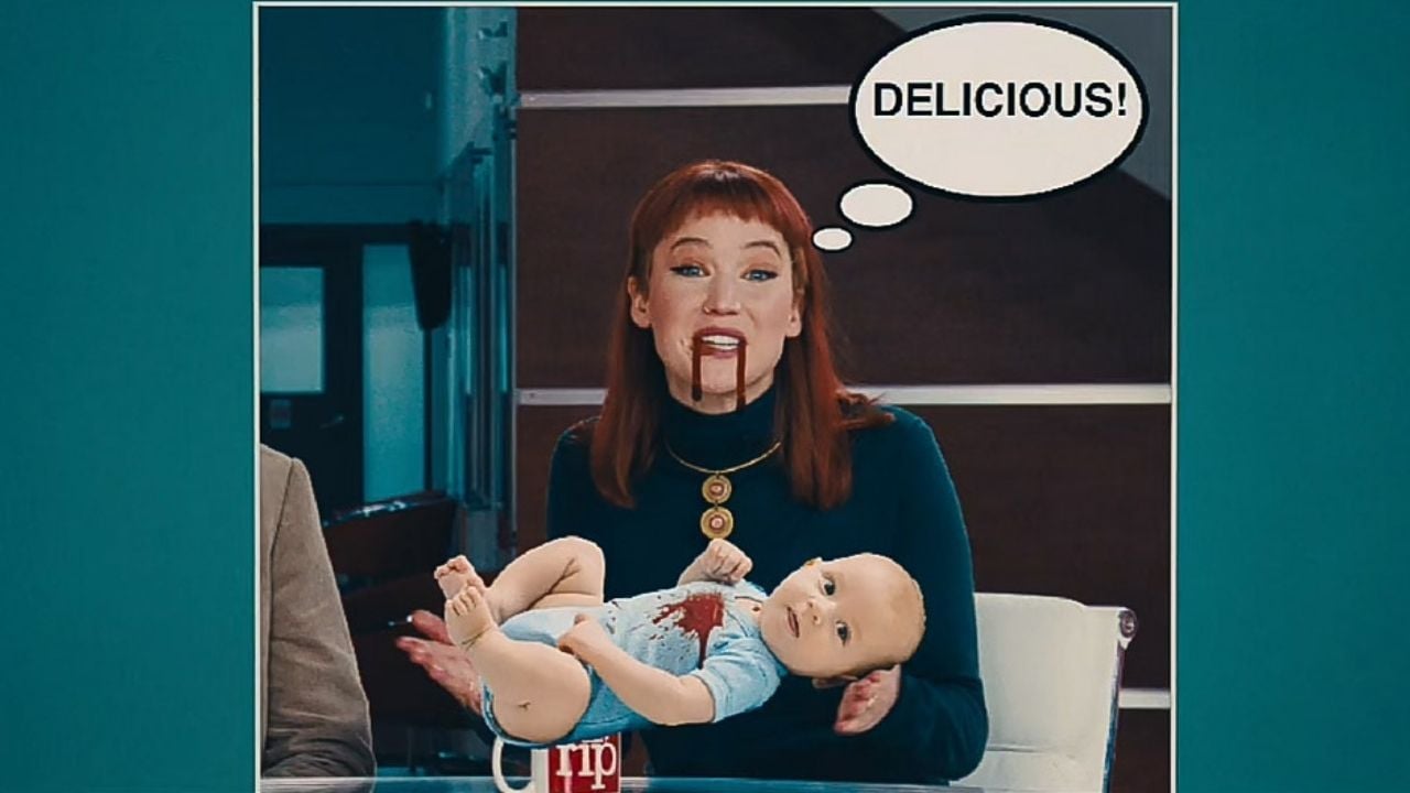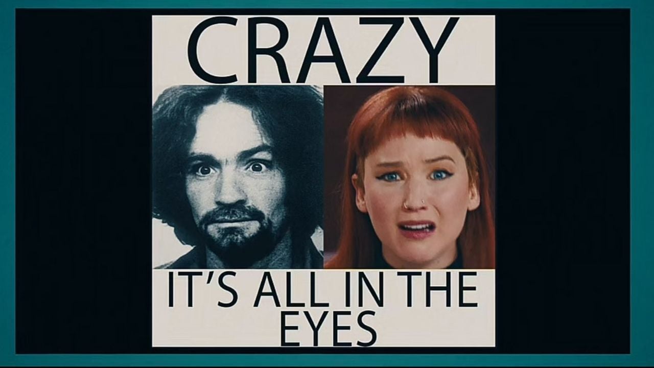 Es muy drástico comparar la expresión desesperada del personaje de Lawrence, con la mirada piscótica de Charles Manson, líder de la sangrienta secta que acabó con la vida de Sharon Tate, pareja del director Roman Polanski. Sin embargo, para fines prácticos de la cinta, le da la ironía necesaria para desatar las risas.