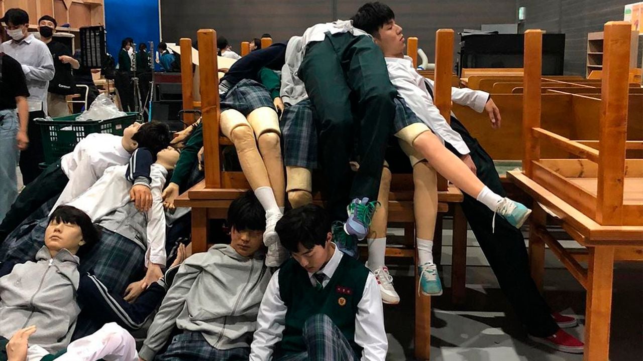 Esta imagen detrás de cámaras de Estamos muertos muestra cómo la producción de Netflix también utilizó algunos maniquíes como parte de los escenarios, fue así como lograron tener tantos cuerpos inertes en cada escena.