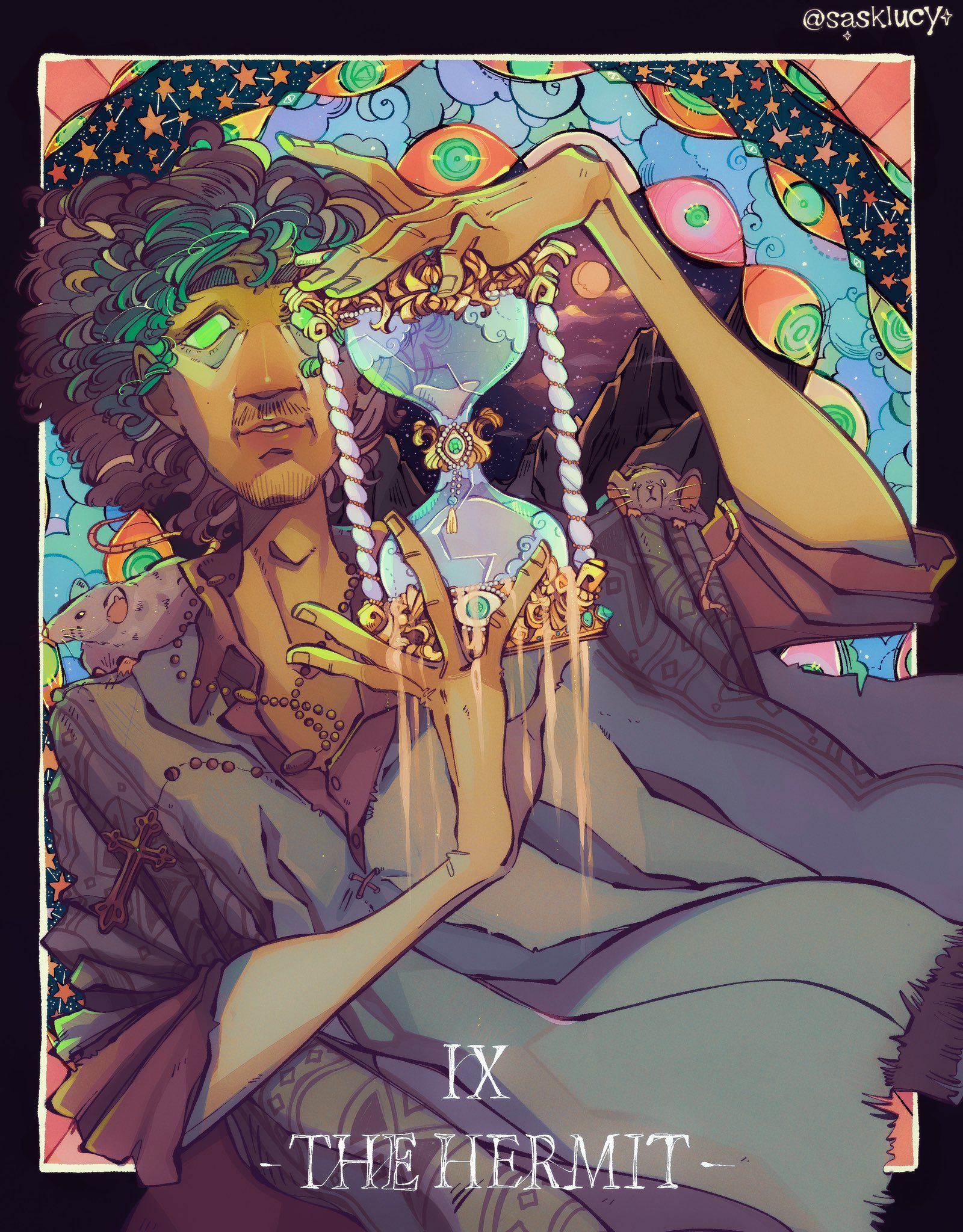 Estos diseños los compartió a través de sus redes sociales y página web, comenzando con Bruno Madrigal a quien lo renombró "El ermitaño", lo cual se relaciona directamente con la historia de este personaje, quien después de compartir sus visiones del futuro, su familia comenzó a temerle y lo fueron alejando. En la ilustración se observa cómo manipula un reloj de arena con algunas gemas y múltiples ojos a su espalda, además de sus compañeros roedores.