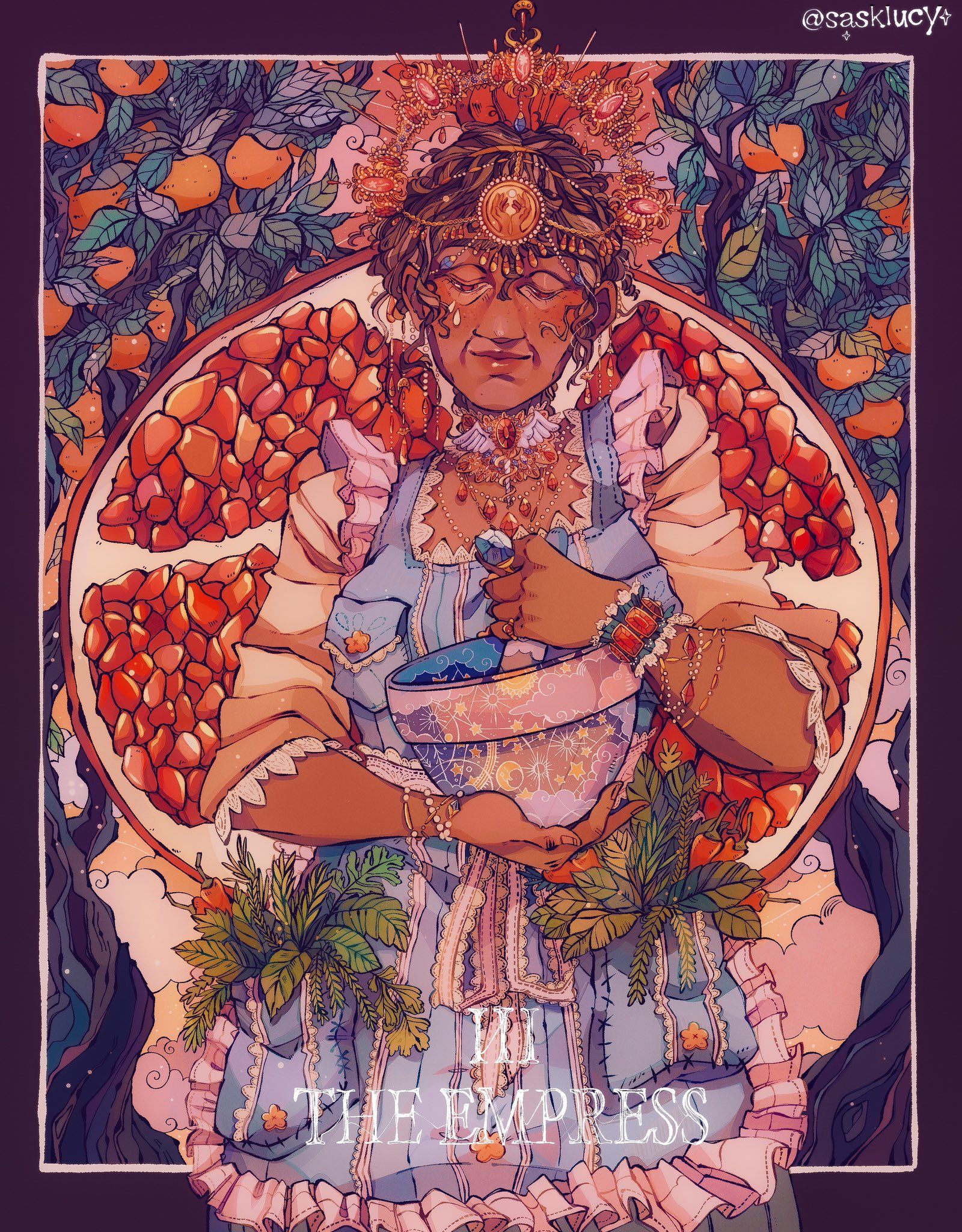 La siguiente carta de tarot llamada "La emperatriz" tiene a Julieta Madrigal como protagonista. Sí, madre de Mirabel, quien a través de sus platillos puede curar cualquier herida o malestar. Y fue precisamente esta habilidad la que Saskia empleó en su ilustración: en los costados aparecen algunos frutos colgados de árboles, mientras que un montón de hierbas surgen de los bolsillos de su mandil. En la cabeza porta una corona con la imagen de unas manos curativas.