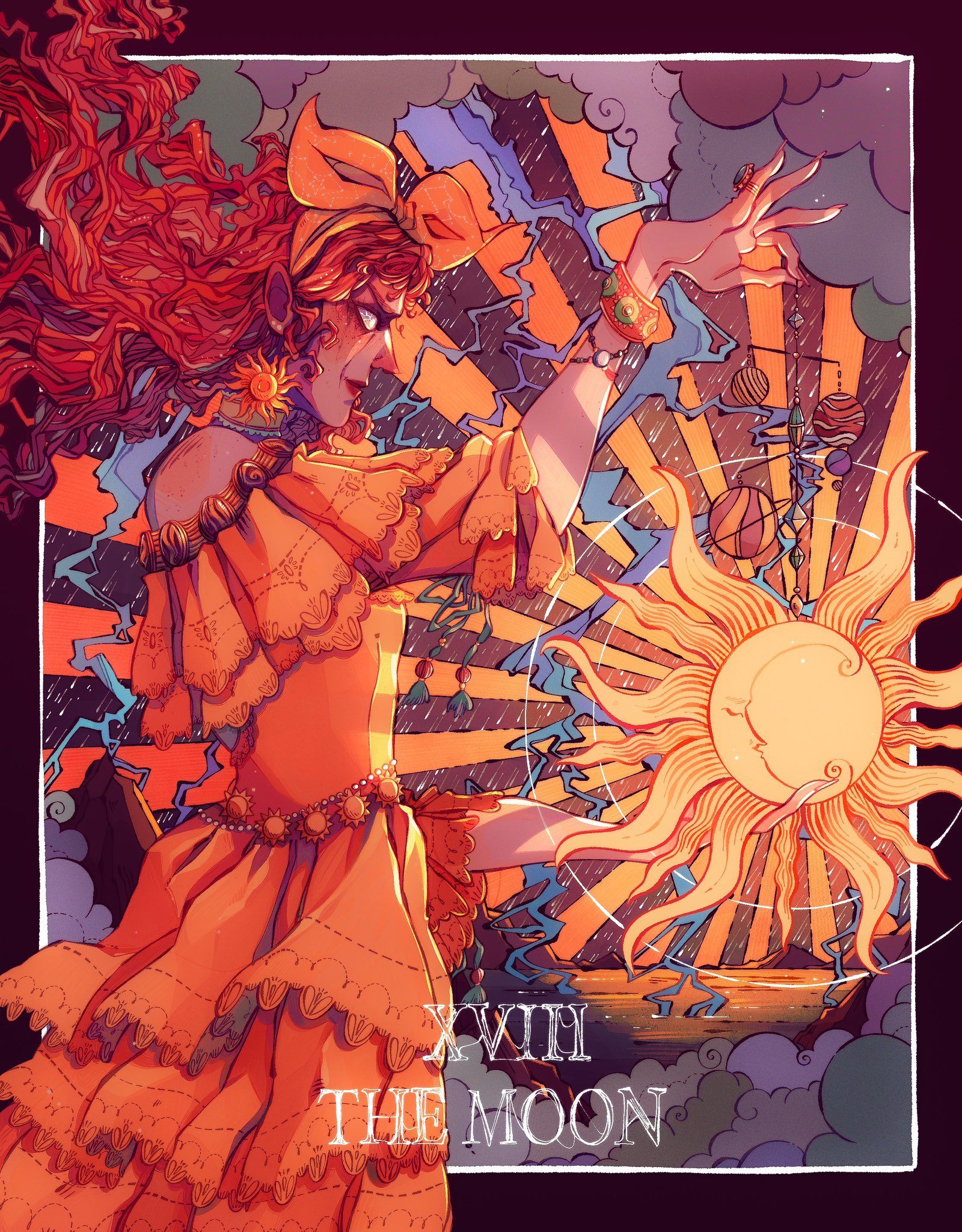 Ahora es el turno de Pepa Madrigal, quien representa la carta "La luna", esto debido a sus poderes de controlar la fuerza de los elementos a través de su estado de ánimo. A lo largo de la película podemos ver cómo es capaz de crear un poderoso tornado, lluvia ligera o volver un día nublado en soleado según sus sentimientos. Este caos fue representado por la ilustradora y vemos a la tía de Mirabel sosteniendo un sistema solar mientras una tormenta se percibe en el fondo.