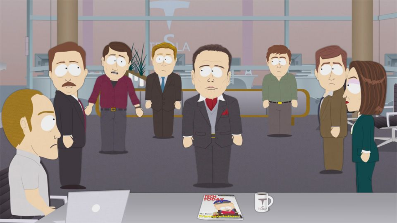 Elon Musk aparece en la temporada 18 del programa, con la voz de Matt Stone. Este episodio lo muestra conduciendo un Tesla en Wacky Races. Pero para la temporada 20 volvió a aparecer y ahora sí se dio voz a sí mismo, y en el episodio da un recorrido por el edificio SpaceX.