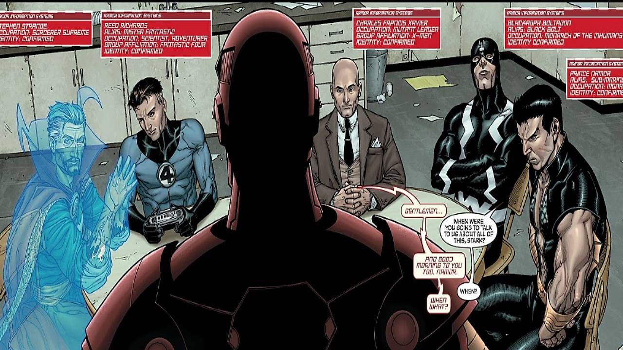 Es Tony Stark quien convoca a una junta secreta en Wakanda. Él personalmente llama al resto de los integrantes para exponer que la guerra skrull-kree fue, en parte, responsabilidad de ellos, porque todos tuvieron información necesaria para contrarrestar la invasión y nadie actuó para evitar la tragedia. Estudió a cada uno de los invitados y llegó a la conclusión que sus habilidades e información pueden prevenir de otra catástrofe.  Iron Man es pilar de los Illuminati por ser el único hombre sin superpoderes, que se vale de su ingenio, fortuna y liderazgo para crear estrategias. Su conocimiento de la oscuridad humana es primordial en el equipo. Esta reunión sienta las primeras bases de la inminente Civil War, pues una de las propuestas de Tony es la regulación de sus actividades, tener todo registrado, saber cada movimiento de todo superhéroe para crear una sociedad más organizada. Por supuesto, aquí hubo conflictos, específicamente con Namor.  Desconocemos si habrá un cameo de Robert Downey Jr. o de un Hombre de Hierro de otro universo, especulan a Tom Cruise como Superior Iron Man en Doctor Strange 2, sin embargo, ya hubo un acercamiento en el MCU, específicamente en el celular de Tony. Tiene una aplicación que envía una señal directa a esta sociedad secreta.