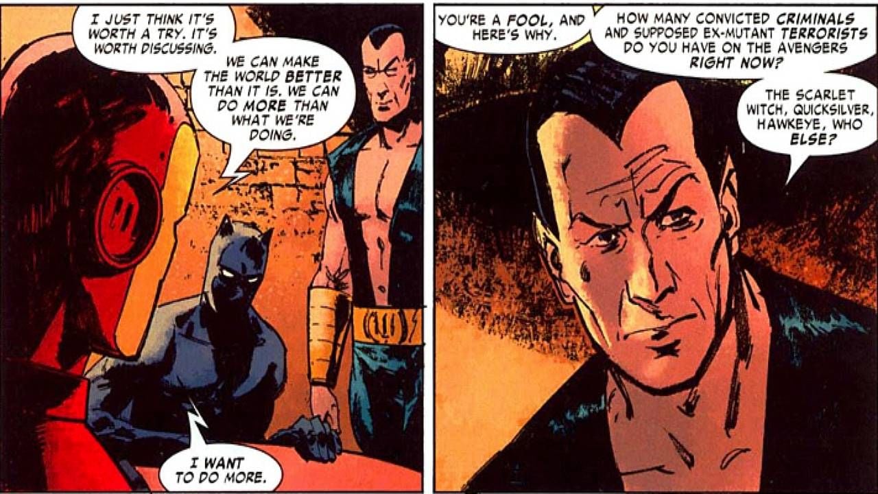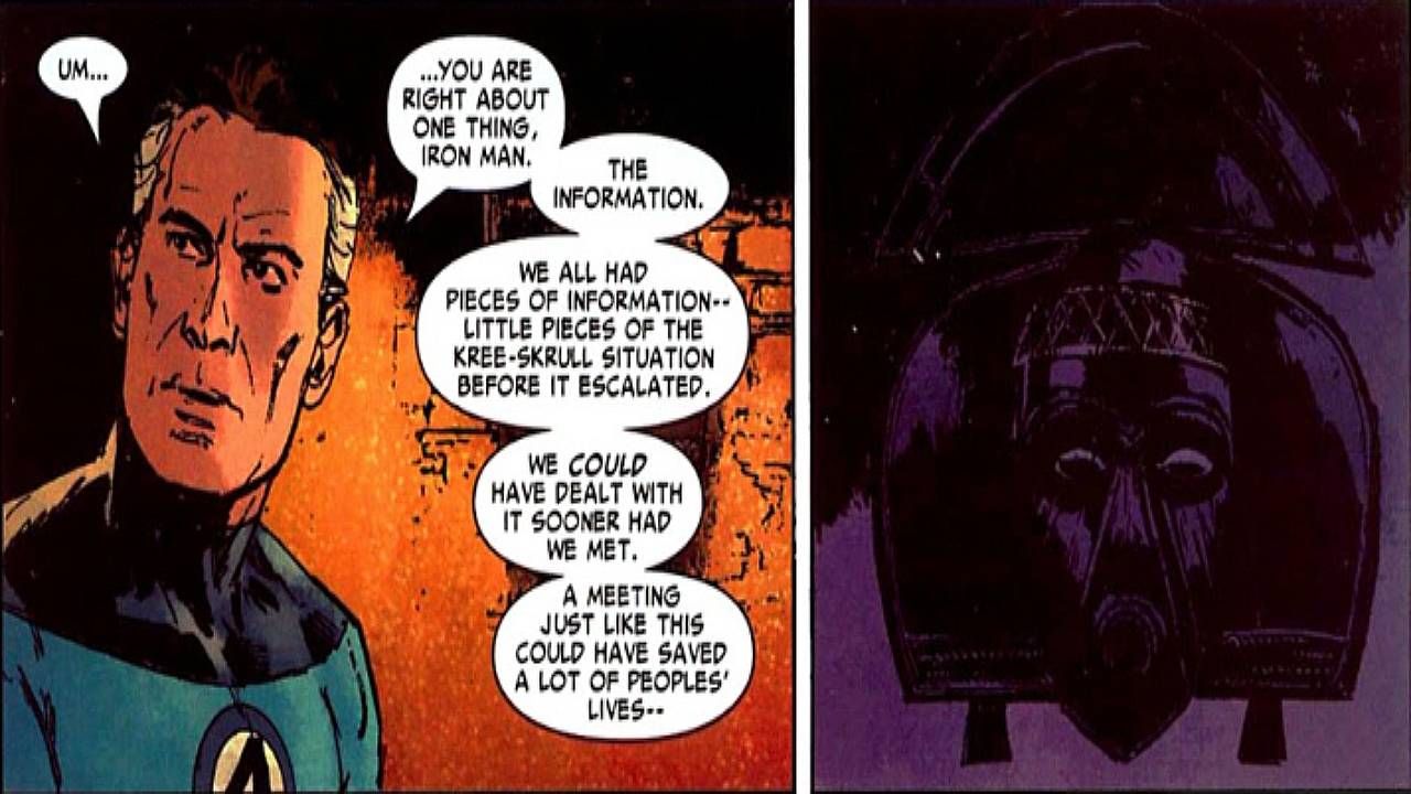 Namor, visíblemente encabronado, le dice: "¡Quedamos en algo, Tony! ¿Cuándo pretendías avisarnos?". ¿Por qué tanta insistencia? Este grupo fue formado durante la posguerra con los Skrull y Kree para actuar de forma secreta, coherente e inteligente en contra de amenazas terrenales, intergalácticas, divinas, metahumanas y de toda naturaleza; al mismo tiempo acordaron supervisar los métodos y pasos realizados por los superhéroes en la tierra. Por eso el fastidio del atlanteano, ¡no sabían del nuevo grupo de vengadores!