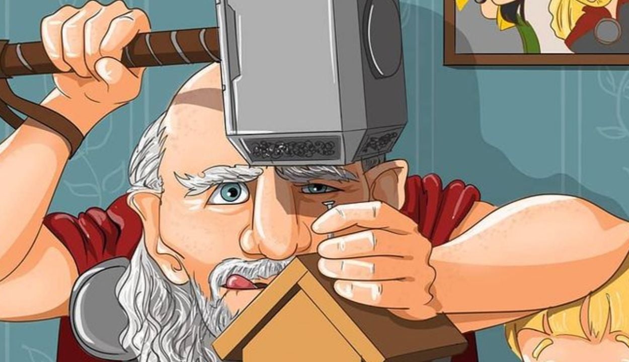 El ilustrador lo pinta como ya un superhéroe retirado en compañía de su nieta y esta vez usando su herramienta no para golpear a algún villano, sino para reparar la casita de un pajarito.
