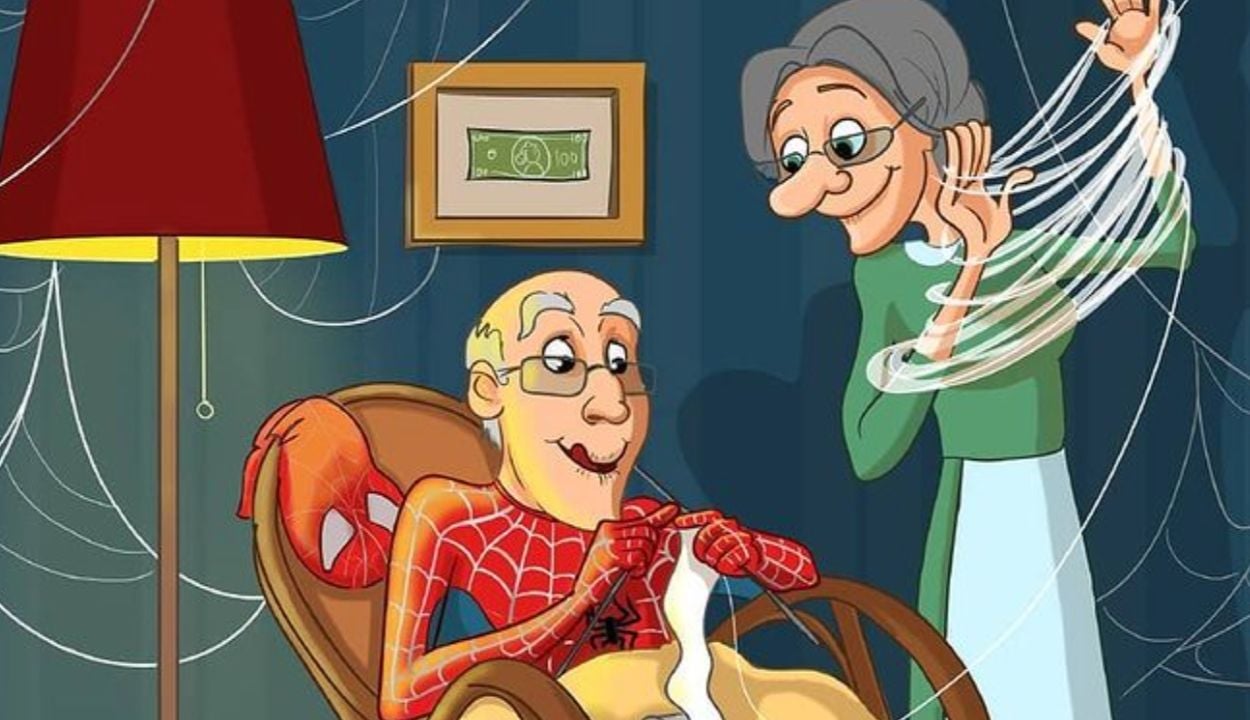 Luego de años trepando muros para atrapar a delincuentes y como bien lo mencionamos, otros personajes raros. El ilustrador dibujó a un 'Hombre Araña' descansando junto a su amada esposa.