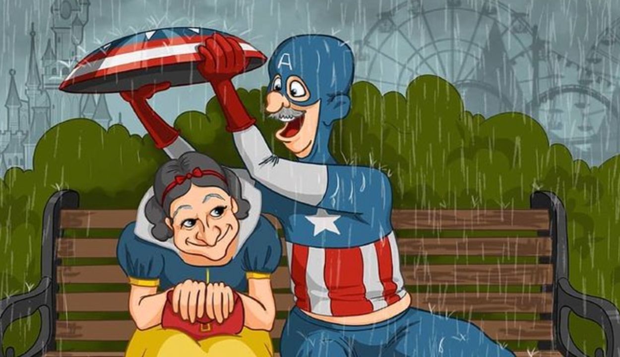Y para cerrar con 'broche de oro', te mostramos a un Capitán América, como siempre caballero y noble hasta en su vejez. I maginemos una escena en la que se encuentra con su amiga 'Blanca Nieves' y de pronto cae una tormenta. Él claro, saca su escudo para protegerla de la lluvia.