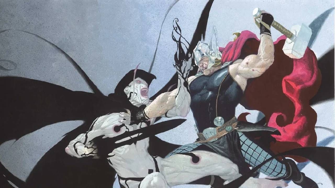 Gorr, Christian Bale en la película, debutó en el cómic Thor: God of Thunder con la intención de castigar y aniquilar a todos los dioses, hasta que es derrotado por el dios del trueno. El inicio de su cruzada también viene por la muerte de su familia por hambre. La necroespada, también adaptada, aunque de forma menos tenebrosa, se ve mejor en el cómic. Conserva el origen simbionte, no su misma forma. El único pero que tenemos es la derrota fácil de esta criatura.