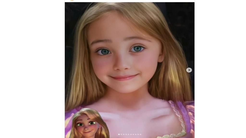 Apartada desde pequeña de la protección de sus padres, Rapunzel vivió gran parte de su vida encerrada en una torre custodiada por su madrastra. Una de sus características más representativas es su cabello largo y rubio que tiene la posibilidad de sanar y rejuvenecer. En la siguiente imagen se puede ver a una pequeña con algunos de sus accesorios, además de que sus rasgos como los ojos y expresión coinciden a la perfección con el dibujo animado, increíble lo que hace la Inteligencia Artificial.