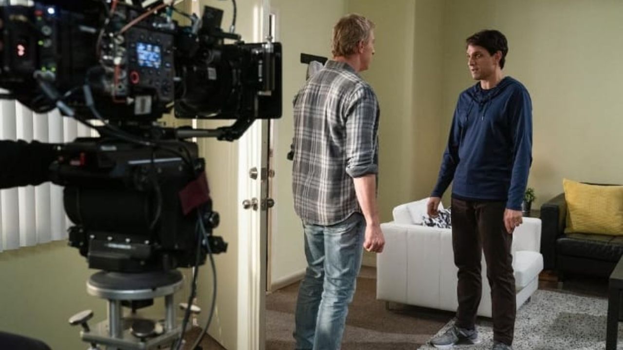 Una imagen detrás de cámaras del momento en que Daniel (Ralph Macchio) busca a Johnny (William Zabka) para pedirle ayuda. Icónica.