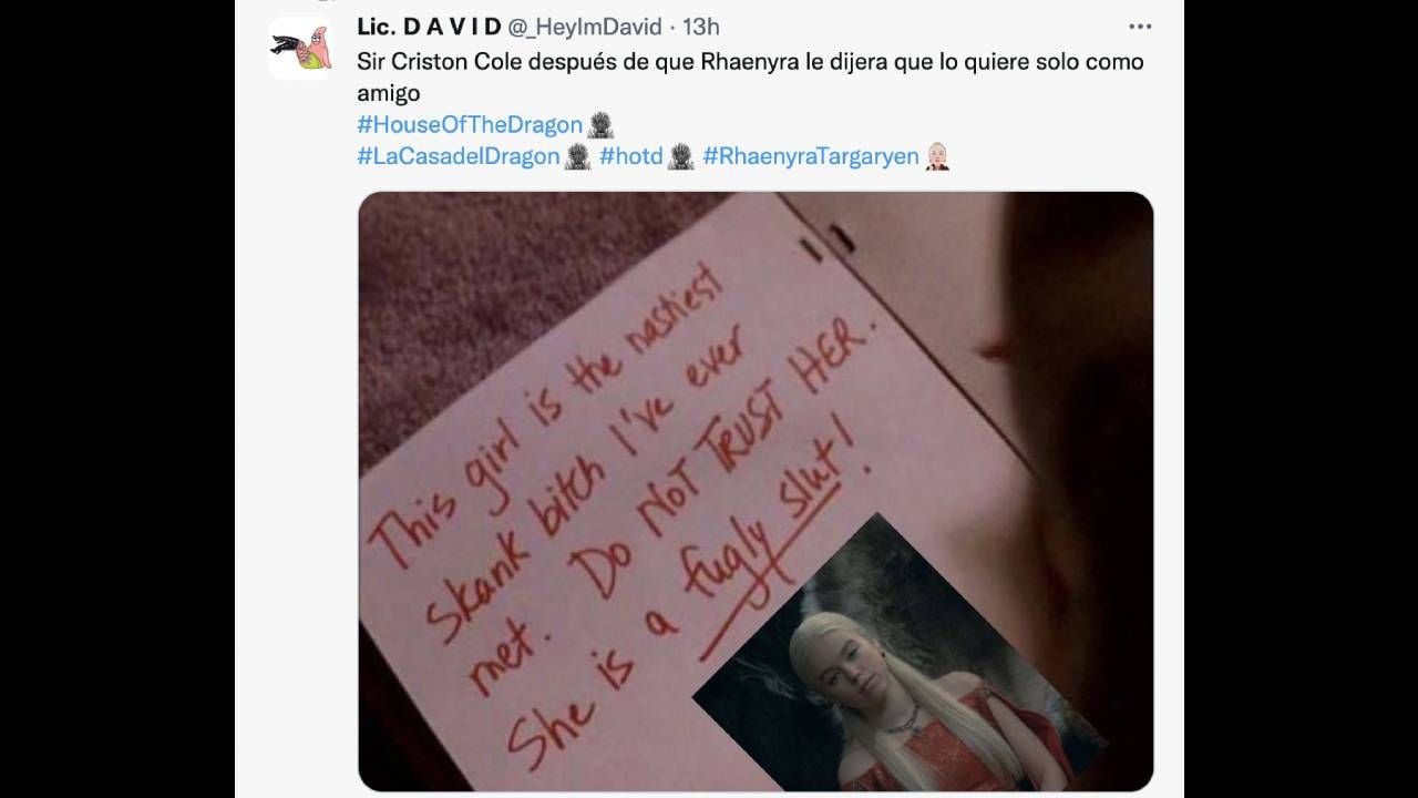 En fin, ni llorar es bueno, además, tampoco estuvo tan mal que hayan hecho de Ser Criston un tipo en exceso ardido. Todo esto fue bien detectado por los fans de la obra de George R.R. Martin y trasladados e una ola de memes que resumen perfecto todo lo que pasó a lo largo de una hora. Reunimos nuestros favoritos para seguir riendo a todo lo que da. Además, no mientan, todos hemos tenido un momento Ser Criston Cole en la vida.