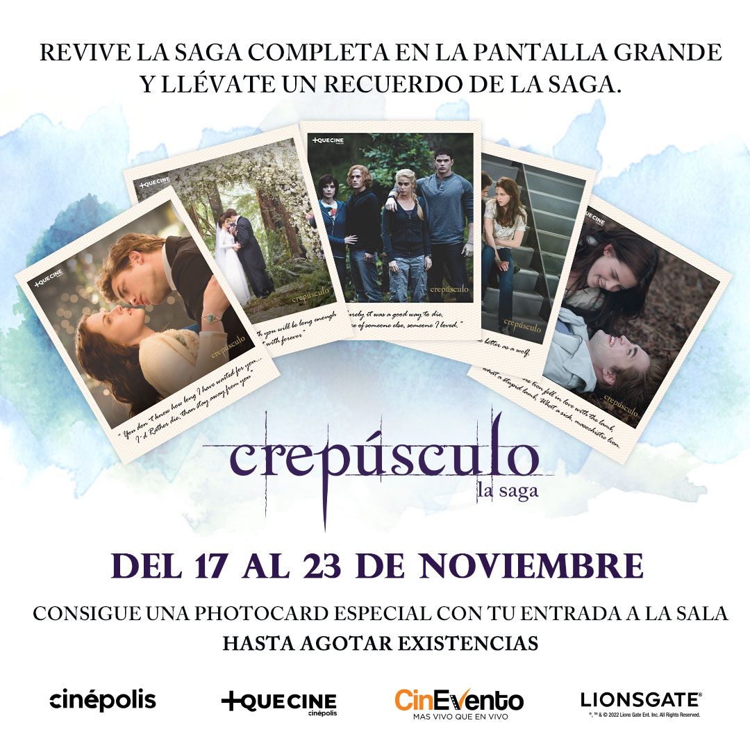 La saga conformada por las cintas Crepúsculo, Luna Nueva, Eclipse y Amanecer llegará algunos complejos seleccionados a partir del próximo 17 de noviembre y permanecerán en cartelera hasta el 23 de ese mes. Pero eso no es todo, +Que cine de Cinépolis ha confirmado a través de redes sociales, que aquellos que asistan a estas proyecciones especiales recibirán una photocard coleccionable al momento de ingresar a su función.