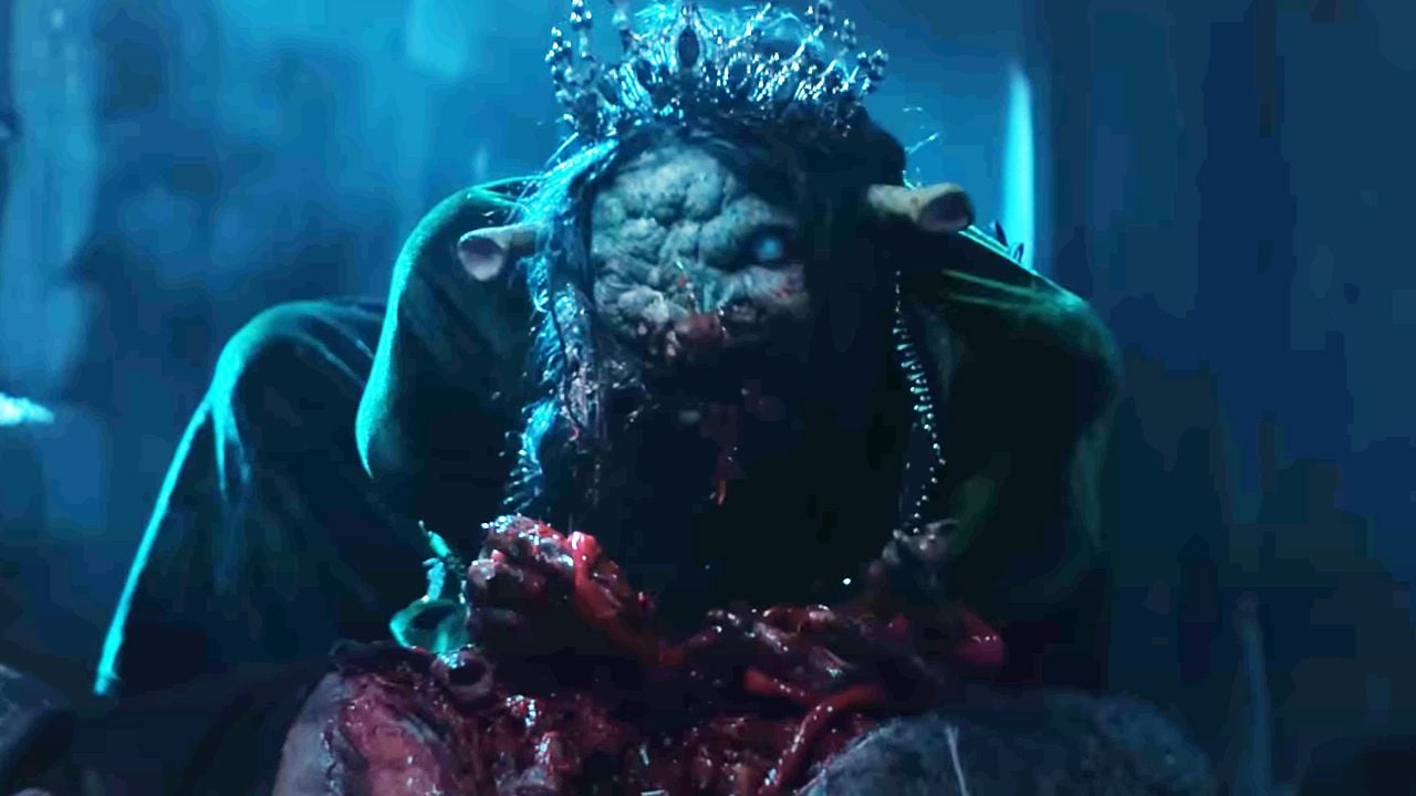 El vestido se desgarra por completo y la corona de la realiza queda fijada a su cabeza llena de arrugas y pelos. Sus ojos se volvieron blancos y su voz, ojo aquí, cambió notoriamente a tal grado de mantener un tono demoníaco. Por supuesto el caballero no la duda y comienza a huir hasta que… se cae (exigencias del guión). Aquí vemos cómo la asquerosa criatura consume un cuerpo desmembrado y, de un instante a otro, ¡se lanza contra el inocente hombre!