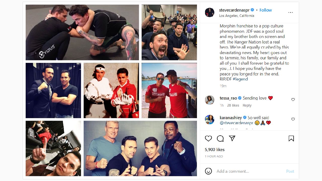Steve Cardenas, quien trabajó con él a partir de la tercera temporada, publicó en su cuenta de Instagram que estaba atónito ante lo que sucedió y se encuentra devastado por la pérdida de su amigo. "Jason David Frank es y siempre será un ícono; dedicó su vida a los Power Rangers y sobre todo a sus fans. Él elevó la franquicia a un fenómeno de la cultura popular. JDF era una buena alma y mi hermano tanto en la pantalla como fuera de ella. La Nación Ranger perdió a un héroe verdadero".