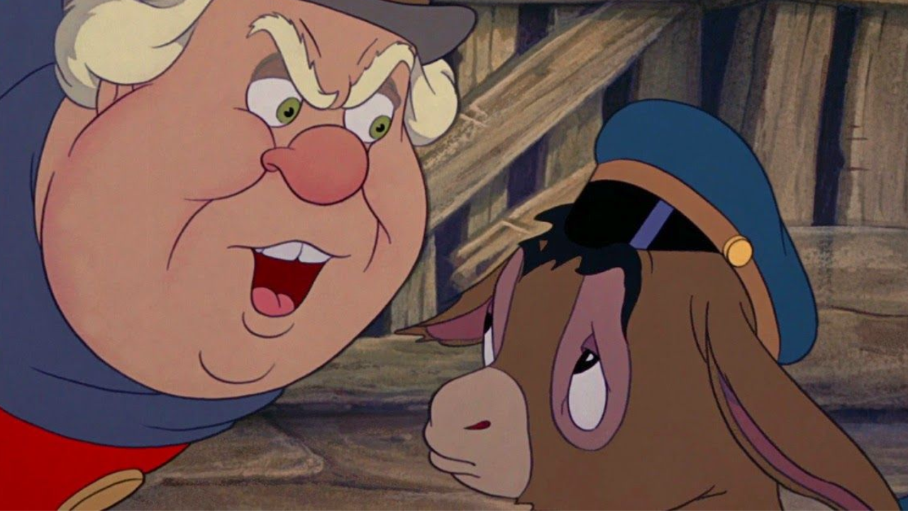 En este paraíso ilusorio, Pepito Grillo se da cuenta que los niños son transformados en burros y posteriormente vendidos como esclavos. Una de las tomas más impactantes de la película muestra la imponente sombra del cochero frente a los burros que gritan desesperadamente. Y si eso no fuera suficiente, vemos la dolorosa y prolongada transformación de Polilla. La traumatizante escena está llena de imágenes angustiosas y un trabajo de voz insoportable que amplifica brillantemente el momento desgarrador.
