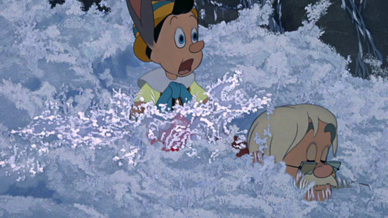 Después de que Monstruo (la ballena gigante) rompe la balsa, Pinocho se ahoga tratando de salvar a su padre y demuestra que es valiente y desinteresado. Geppetto sobrevive, pero en un plano prolongado vemos a Pinocho que está boca abajo y quieto en el océano. Incluso los peces lloran sobre su cuerpecito empapado de agua, como si eso no fuera a causar pesadillas.