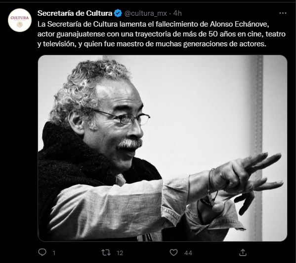 “Con profunda tristeza despedimos a nuestro primer actor, Alonso Echánove, reconocido en la primera edición del BJXfest, y que con más de 50 años de trayectoria en el teatro, televisión y cine nos ha dejado un gran legado a los guanajuatenses. Descanse en paz”.
