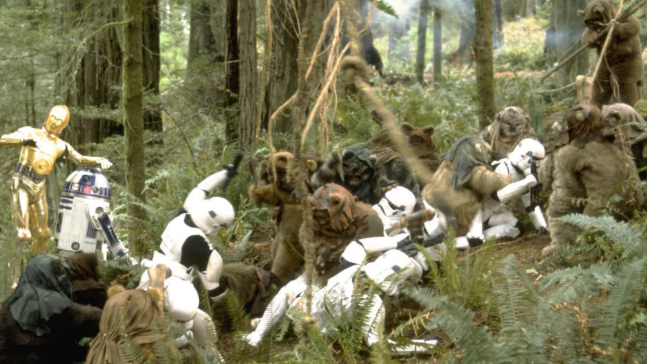 Los Ewoks casi se comen a Luke Skywalker (Mark Hamill), Han Solo (Harrison Ford) y Chewbacca (Peter Mayhew) al capturar a los héroes rebeldes. Además, en el final de la película, se muestra a los Ewoks tocando los cascos vacíos de Stormtroopers, Scout Troopers y los Imperial Navy Troopers como tambores.