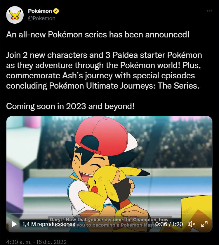 “Se ha anunciado una nueva serie Pokémon! Únete a 2 nuevos personajes y 3 Pokémon iniciales de Paldea en su aventura por el mundo Pokémon. Además, conmemora el viaje de Ash con episodios especiales que cierran Pokémon Ultimate Journeys: La serie. ¡Próximamente en 2023 y más allá!”, puede leerse en la publicación que va rumbo a las cien mil interacciones.